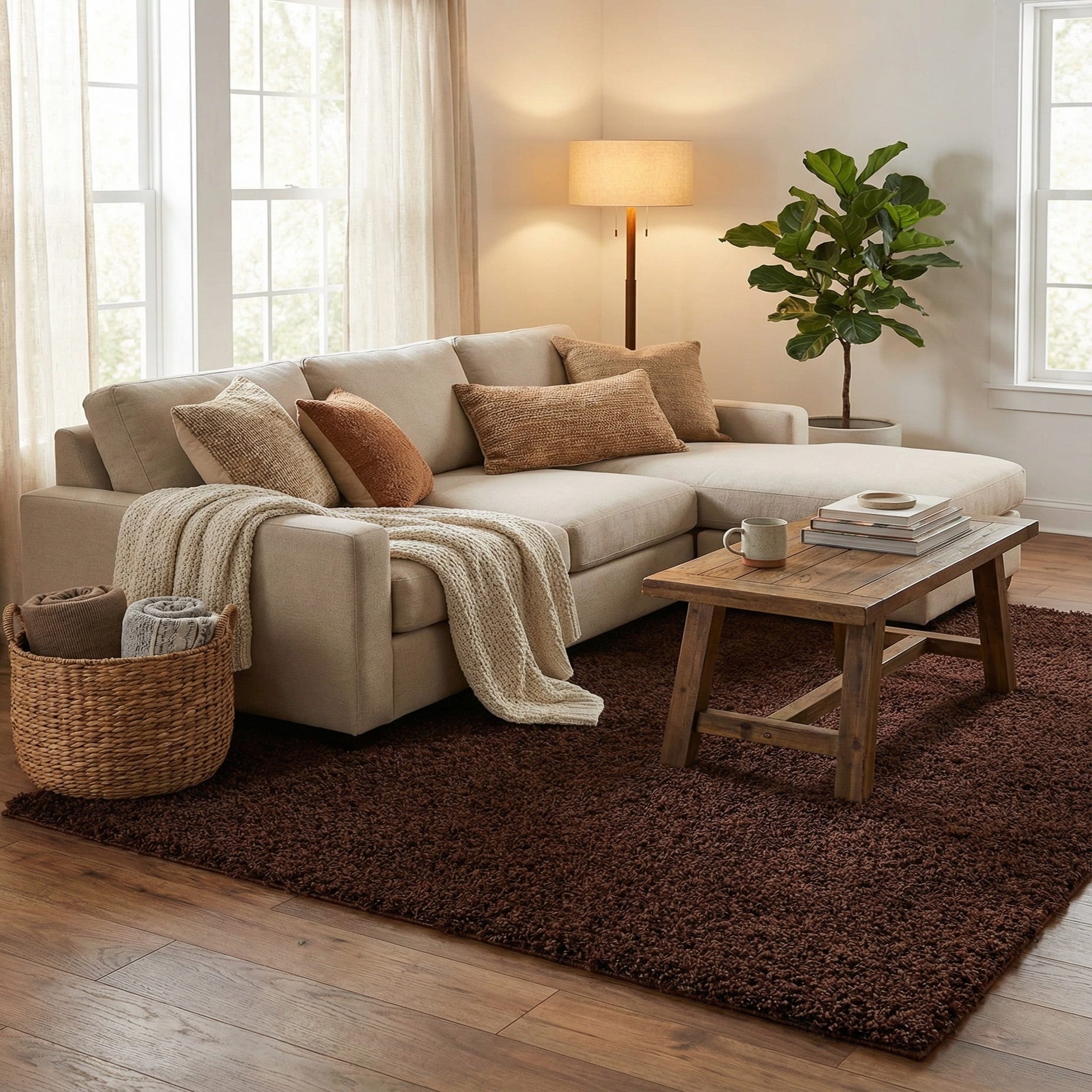 Deep chocolate brown fills this solid shag rug, offering a rich, even field of color and a comfortable, high-pile surface. The dense, long fibers create a layered, tactile texture that cushions each step and invites bare feet. Machine-made from 100% polypropylene, the construction gives the pile a soft hand while holding its structured, shaggy look across daily use.