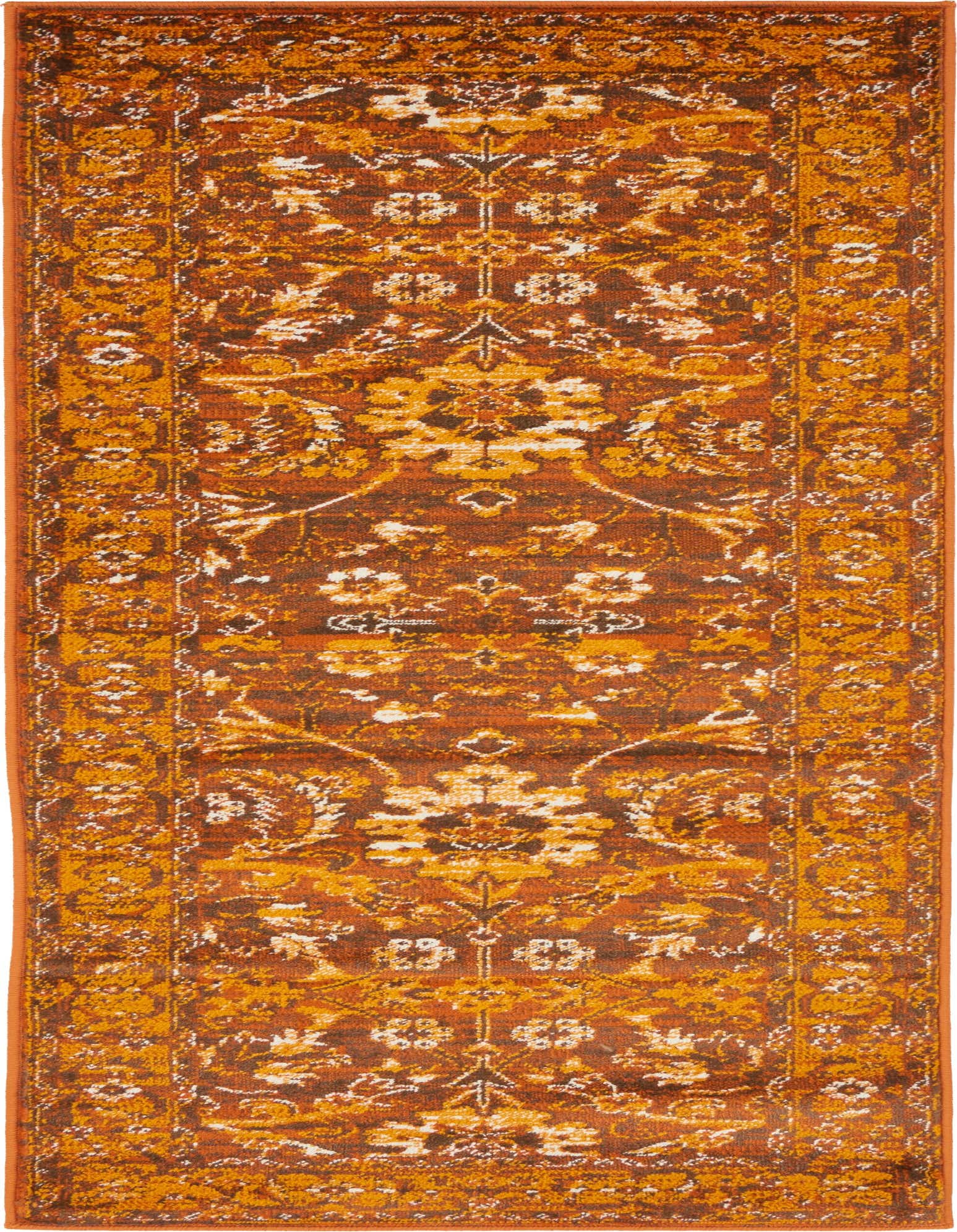 Primary color is Chocolate Brown. Colors in this rug include: Chocolate Brown, Black, Ivory, Orange, Terracotta, Yellow.