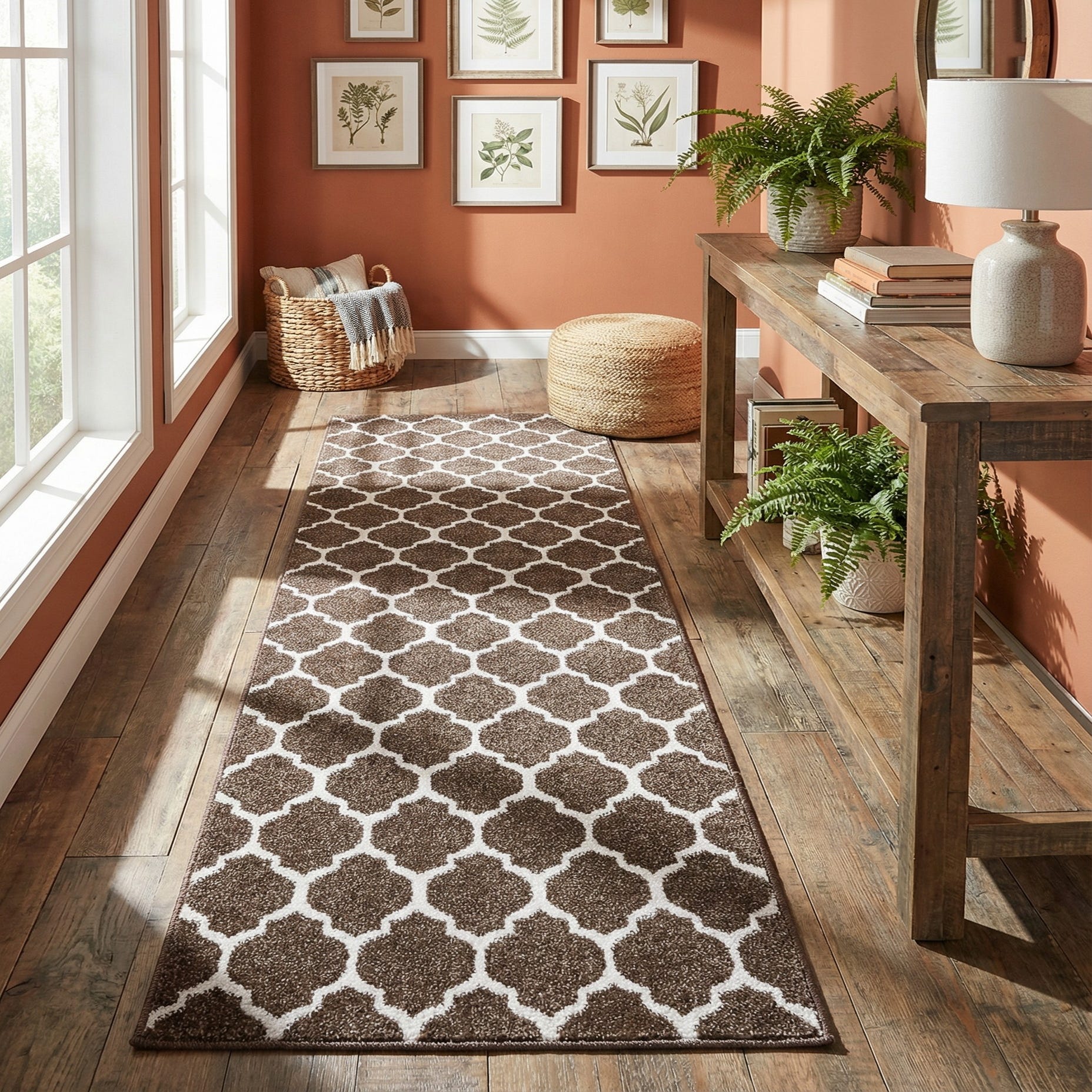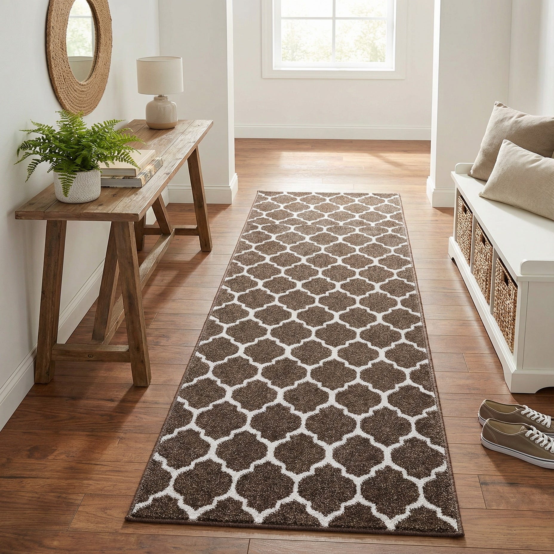 A bold chocolate brown field sets the stage for a repeating lattice of beige quatrefoil motifs. The high-contrast pattern creates a crisp, geometric rhythm that draws the eye down a corridor or anchors a narrow space. Machine made of 100% polypropylene, the rug has a dense, cut-pile surface with a soft, slightly lustrous finish that invites bare feet and adds a tactile layer underfoot.