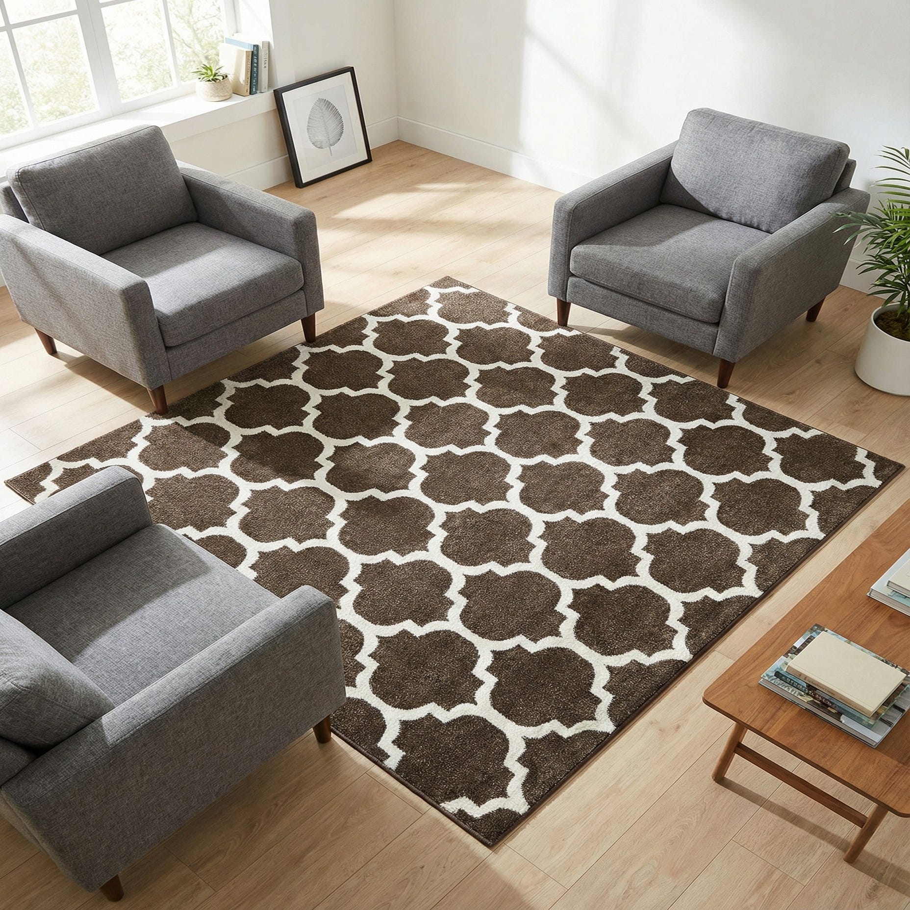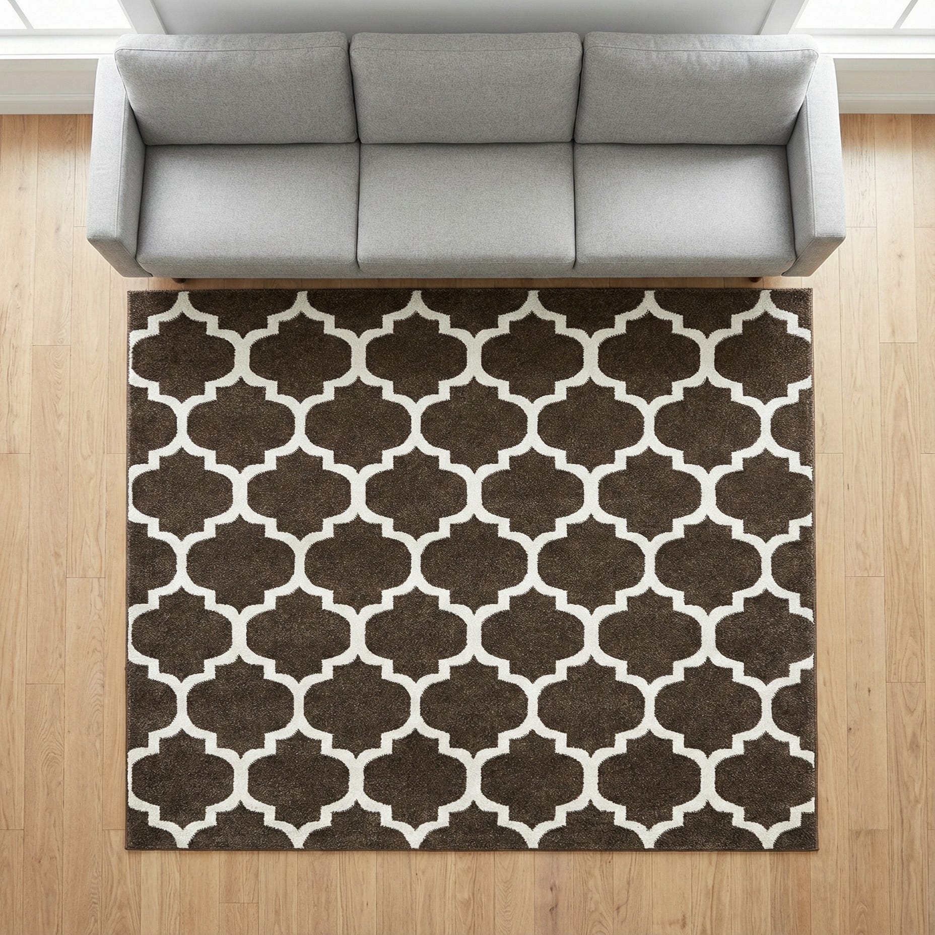 Primary color is Chocolate Brown. Colors in this rug include: Chocolate Brown, Beige.