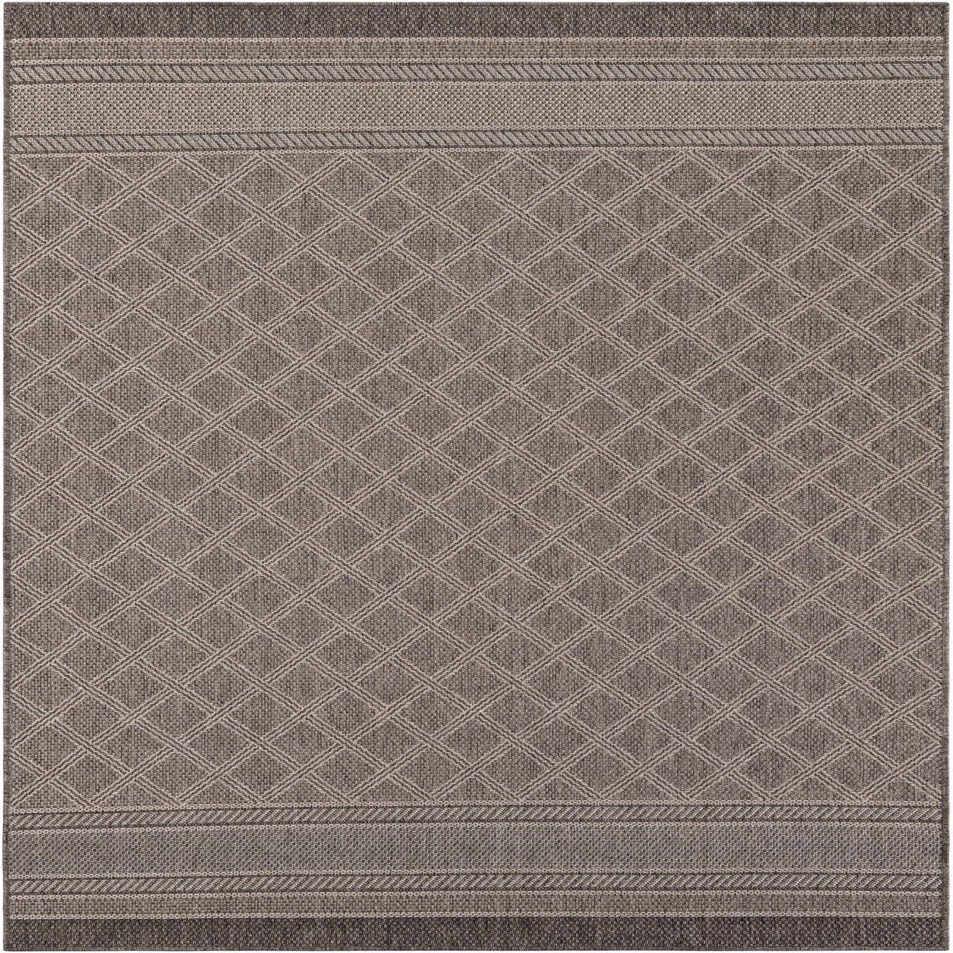A 6x9 rectangular brown and tan indoor/outdoor rug with a modern lattice pattern and striped borders.