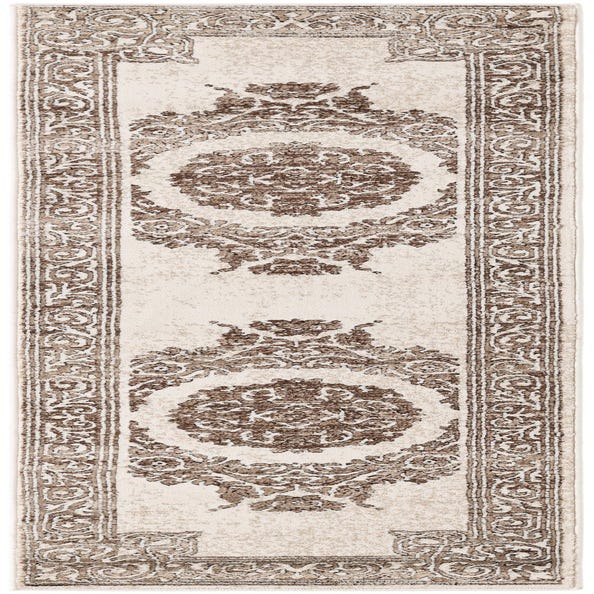 A 7 ft runner rug in browns and tans featuring a traditional medallion and border pattern, suitable for a hallway.