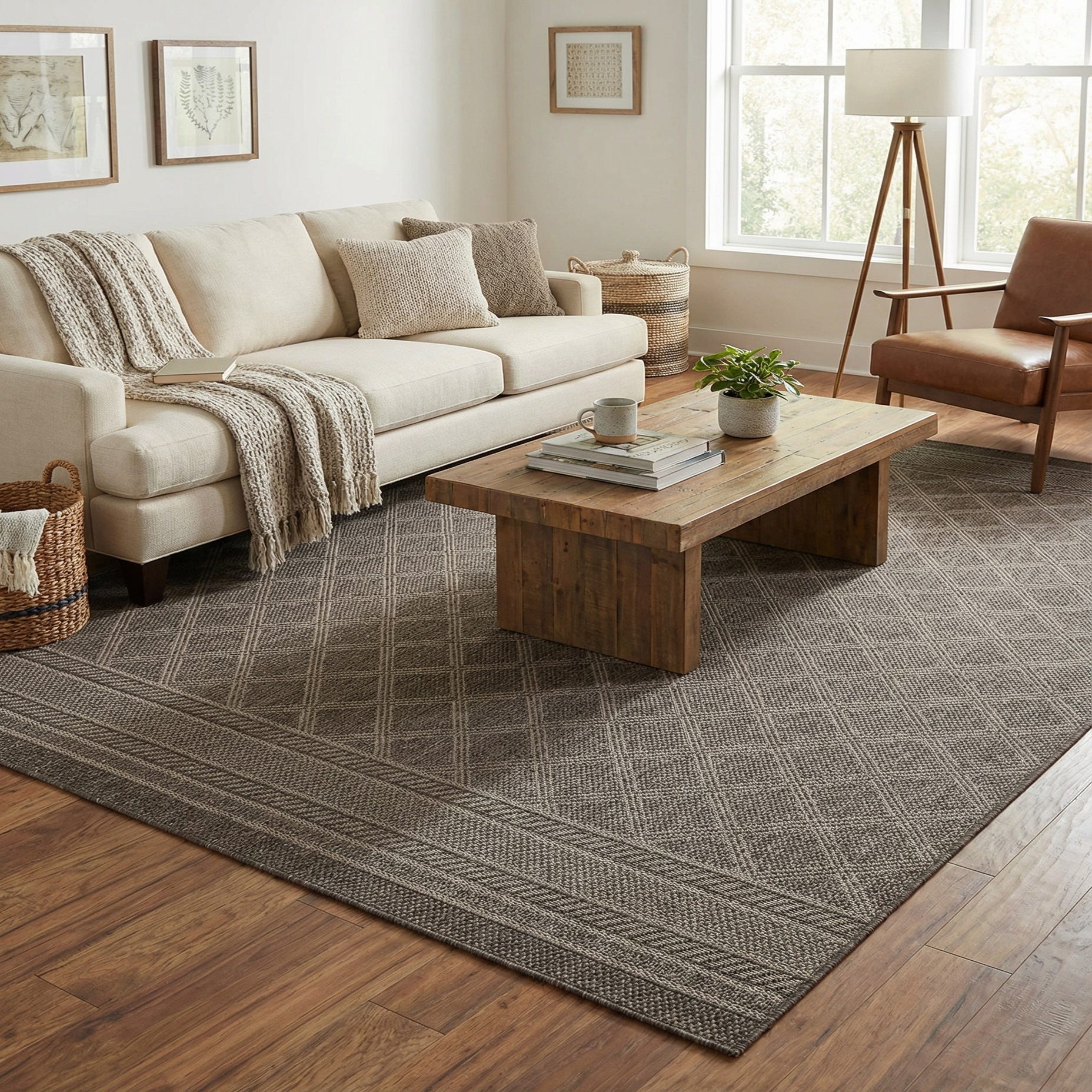 A crisp diamond lattice covers the field of this rug, the beige pattern woven into a Chocolate Brown ground to create a clean, geometric look with warm undertones. A pair of horizontal bands at each end add a restrained border, the narrow rope-and-stripe details introducing a subtle textural contrast to the trellis motif. The surface is low-profile and tightly woven; you can feel a slight raised texture where the beige yarns cross, giving the rug visual depth without a high pile.