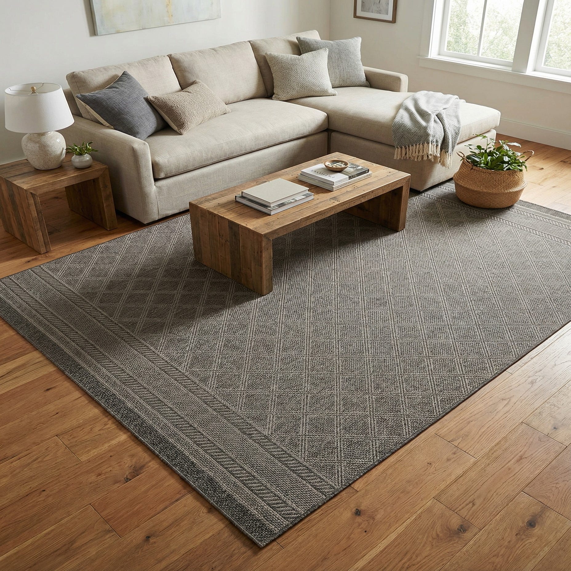 A 7x10 rectangular brown and tan indoor/outdoor rug with a modern lattice pattern and striped border.