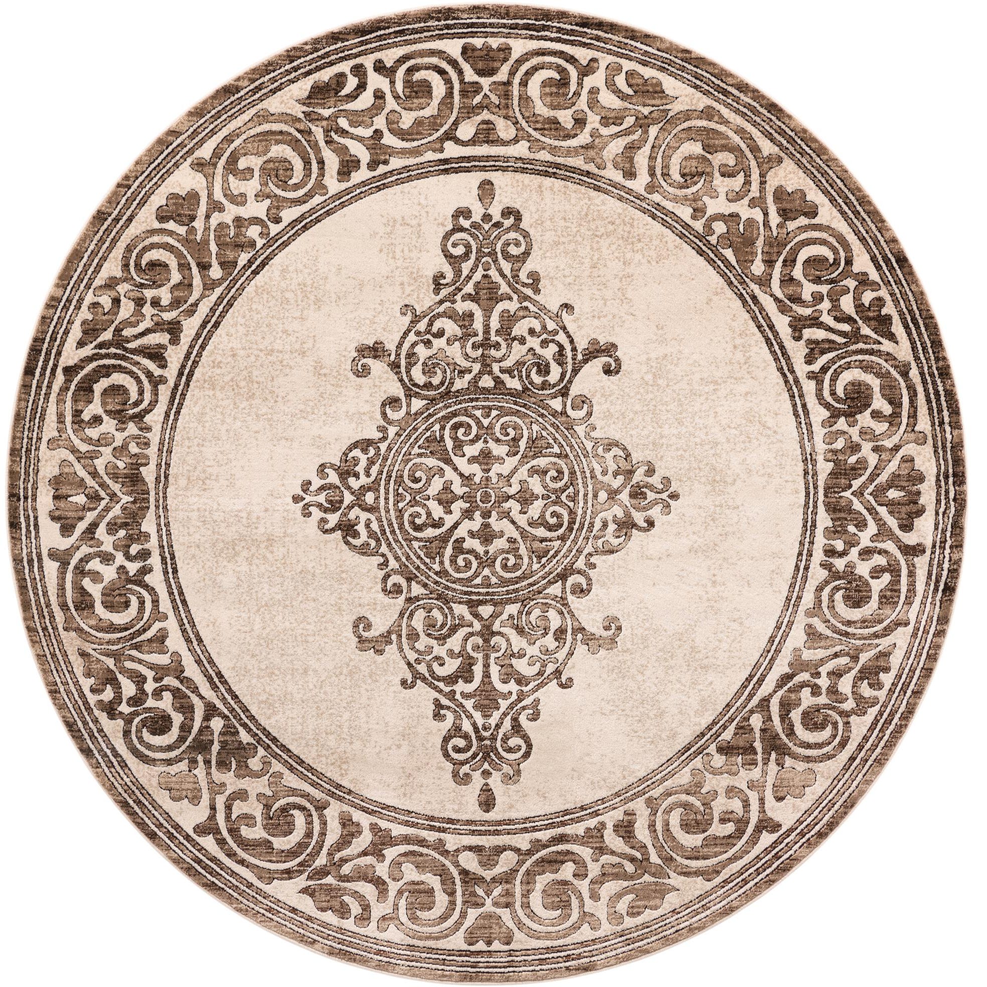 The Hermitage collection presents an elegant 8-foot round rug, machine woven from a blend of 55% polypropylene and 45% polyester, providing both durability and a soft texture. This rug showcases a sophisticated chocolate brown background, accentuated by a central medallion and intricate scrollwork in shades of beige and black. The detailed pattern evokes a timeless sense of tradition, while the balanced use of color ensures that the design provides visual interest without overwhelming a space.