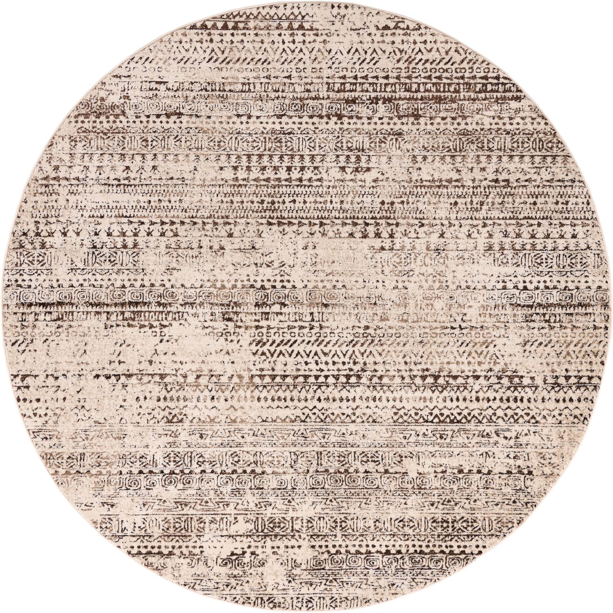 A round brown and tan tribal rug with a distressed modern stripe pattern, featuring high/low textured pile.