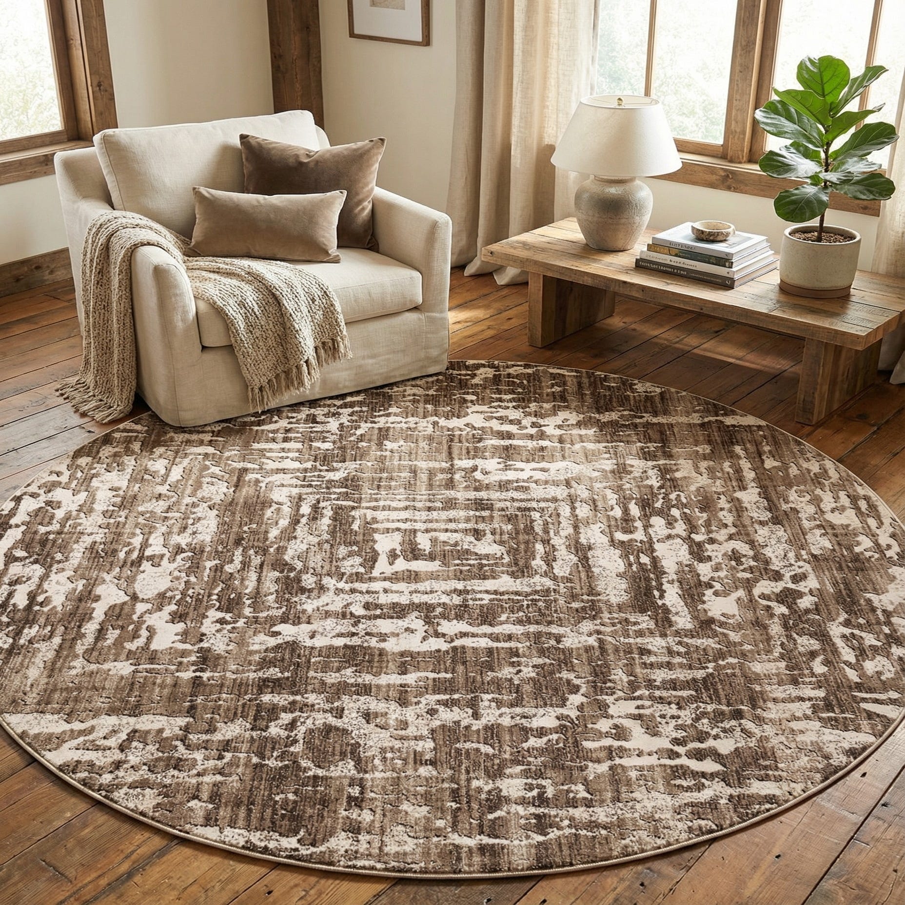 Place this rug beneath a round dining table to define the seating area, or use it in a living room to warm hardwood floors and complement neutral upholstery. It pairs naturally with warm wood finishes, black metal accents, and beige linens—making it a good fit for transitional, modern-rustic, or contemporary interiors. The pattern and palette also work well in a cozy reading nook or home office where understated texture and layered tones are desired.