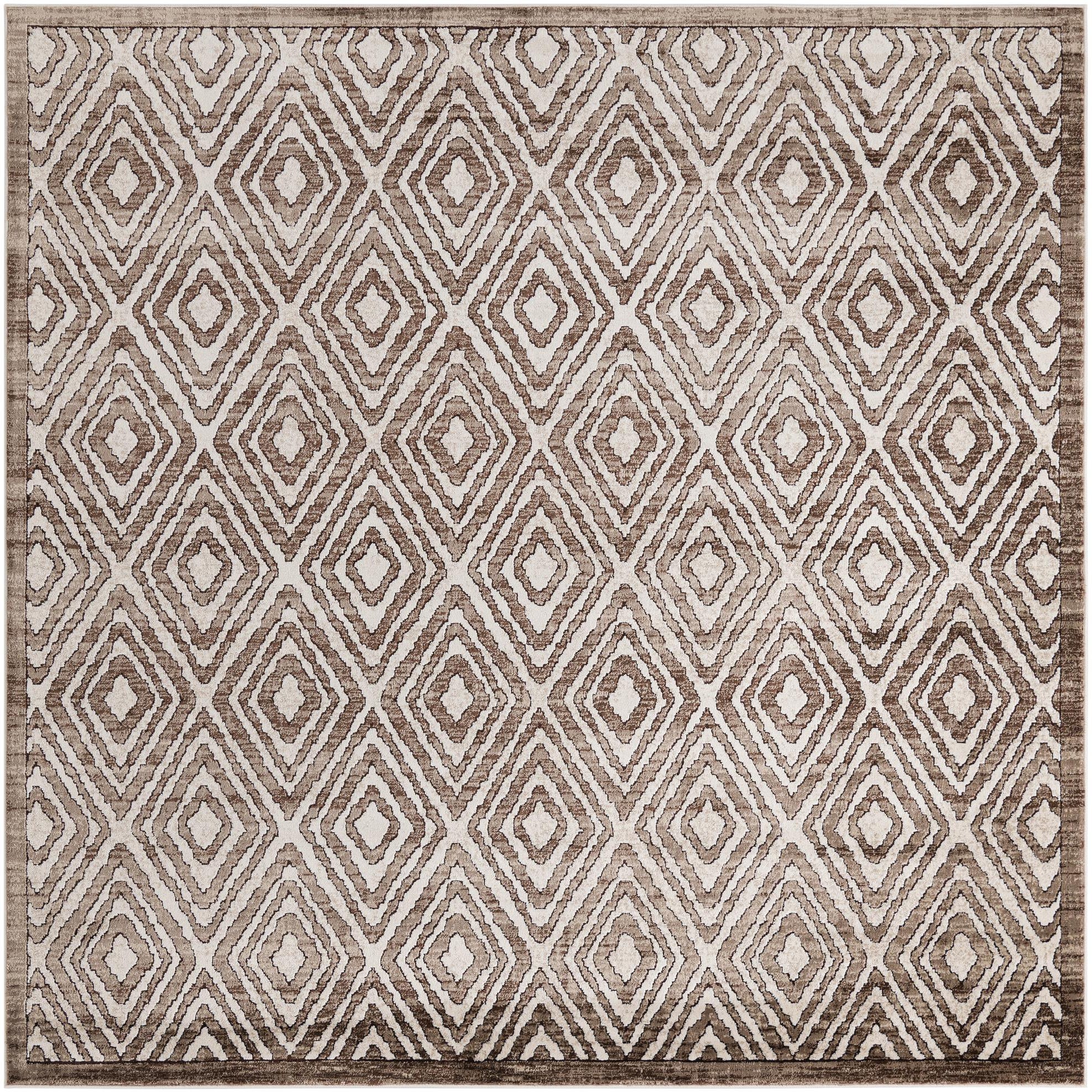 A square 7' 10 x 7' 10 brown and tan area rug with a modern geometric diamond pattern and textured high/low pile.