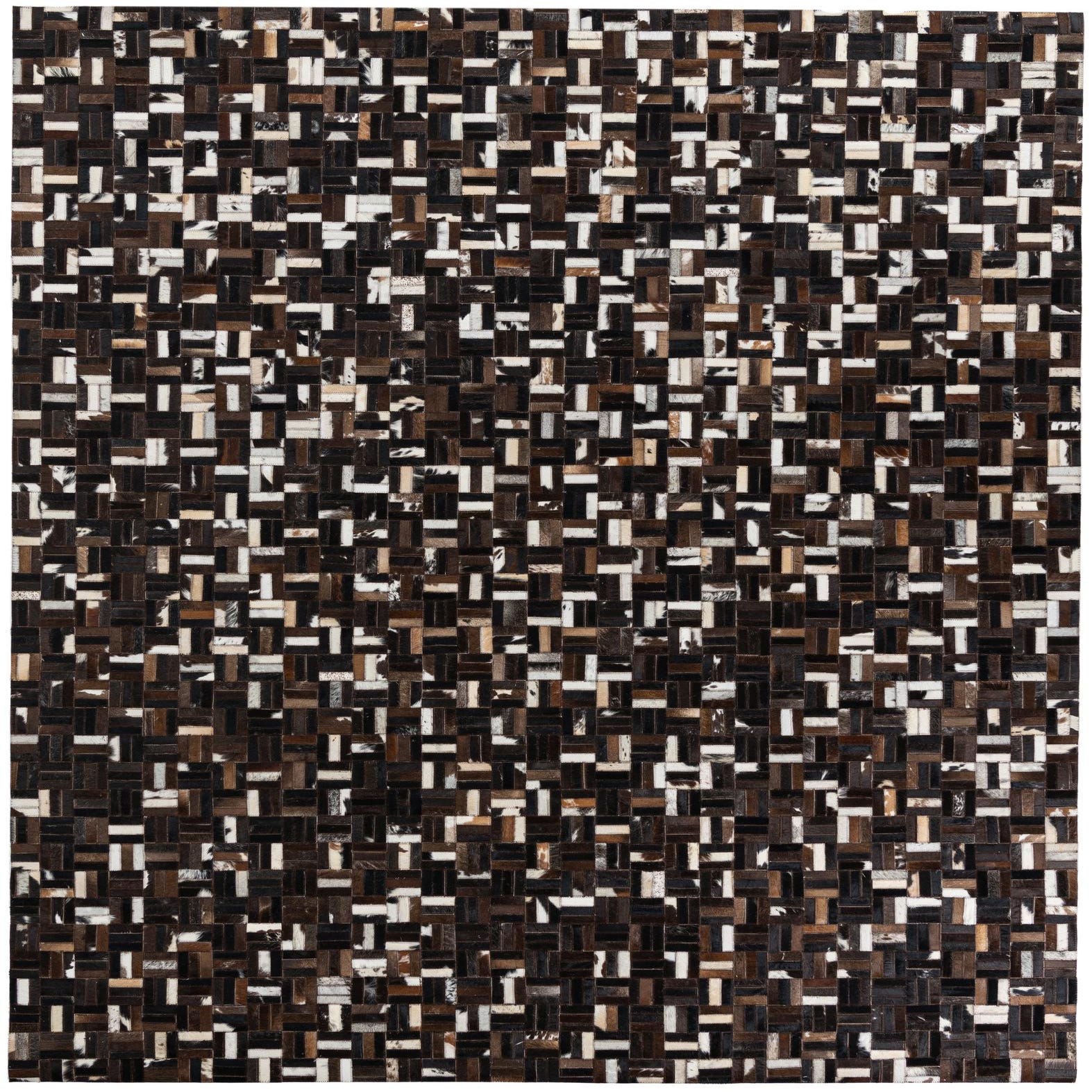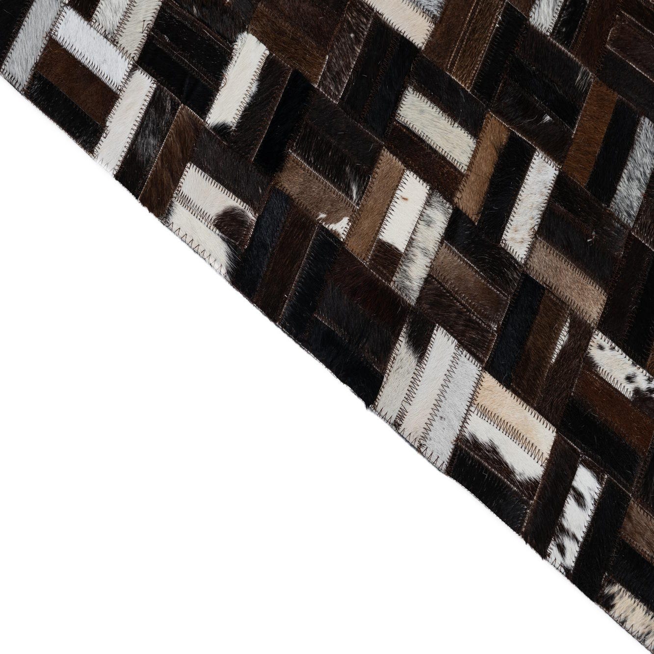 A rectangular 8x10 modern cowhide rug featuring a mosaic pattern of brown, tan, and white leather strips.