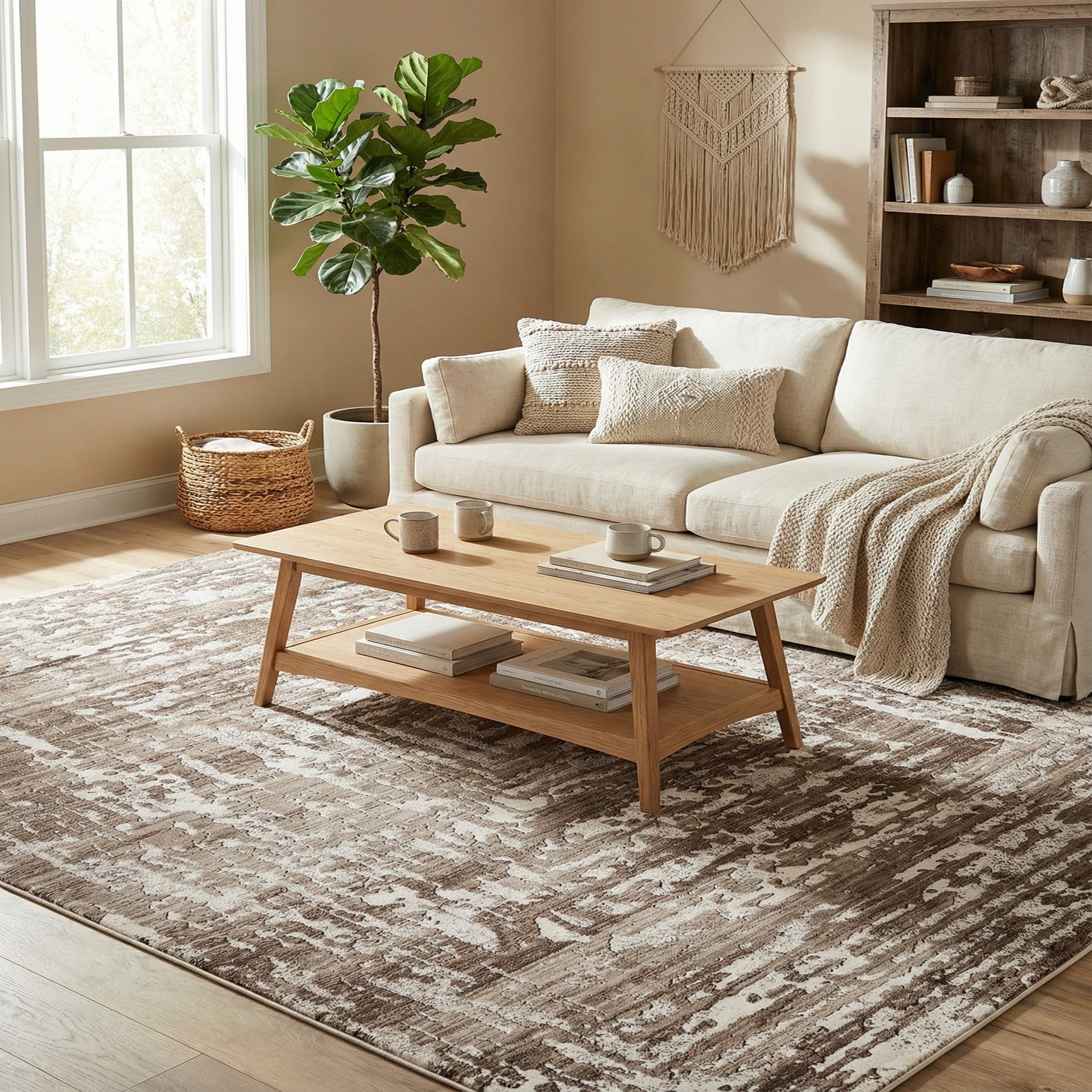 The Hermitage collection rug presents a visually engaging foundation with its chocolate brown background, augmented by beige and black distressing for a contemporary aesthetic. Expertly machine woven from a blend of 55% polypropylene and 45% polyester, this area rug measures 8x11 feet, offering durability alongside its aesthetic appeal. The surface showcases a plush texture that is both comfortable underfoot and visually soothing, contributing to a cozy and inviting atmosphere.