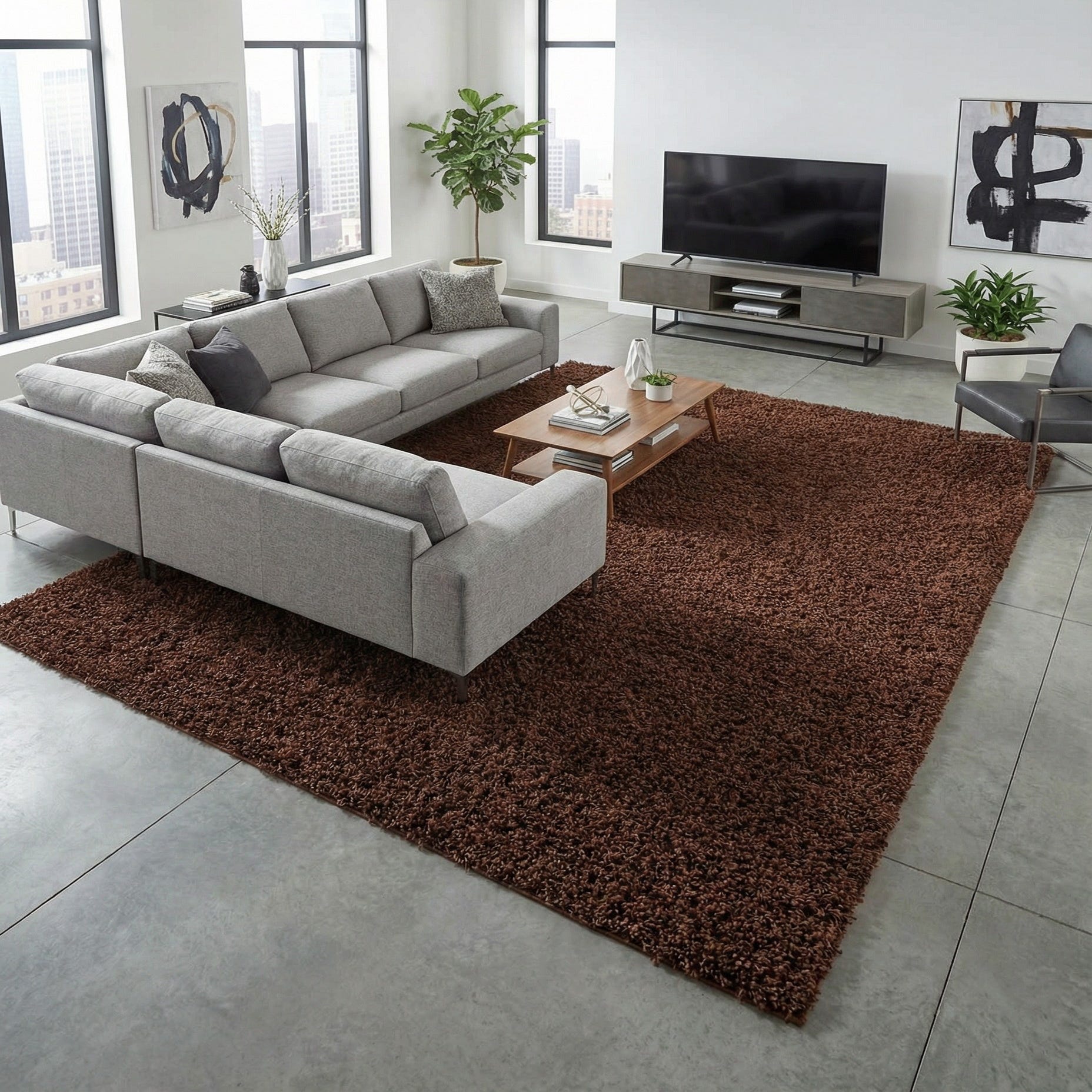 A rich chocolate brown covers this solid shag rug, creating a warm, uniform field of color that anchors a room without drawing attention away from your furnishings. The high-pile construction feels plush and inviting underfoot; running your hand across the surface reveals dense, springy polypropylene fibers with a soft, almost velvety touch and a gentle, low-luster finish. Machine-made craftsmanship produces an even pile and tidy edges for a neat, consistent look.