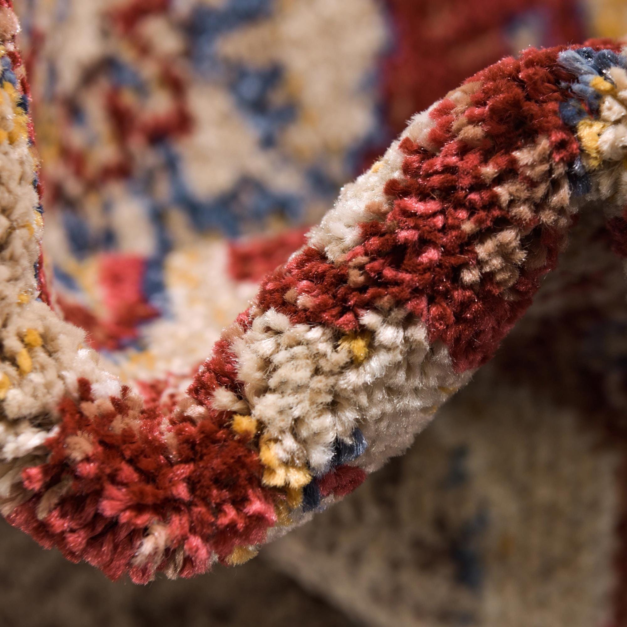 This piece works well in traditional and transitional settings—place it beneath a seating group to anchor a living room with warm wood furniture and leather or neutral upholstery, or use it under a dining table to add pattern without overwhelming the space. The chocolate background pairs naturally with warm paint tones and wood floors, while the touches of blue and cream offer subtle contrast for cooler accents like navy pillows or light linens.