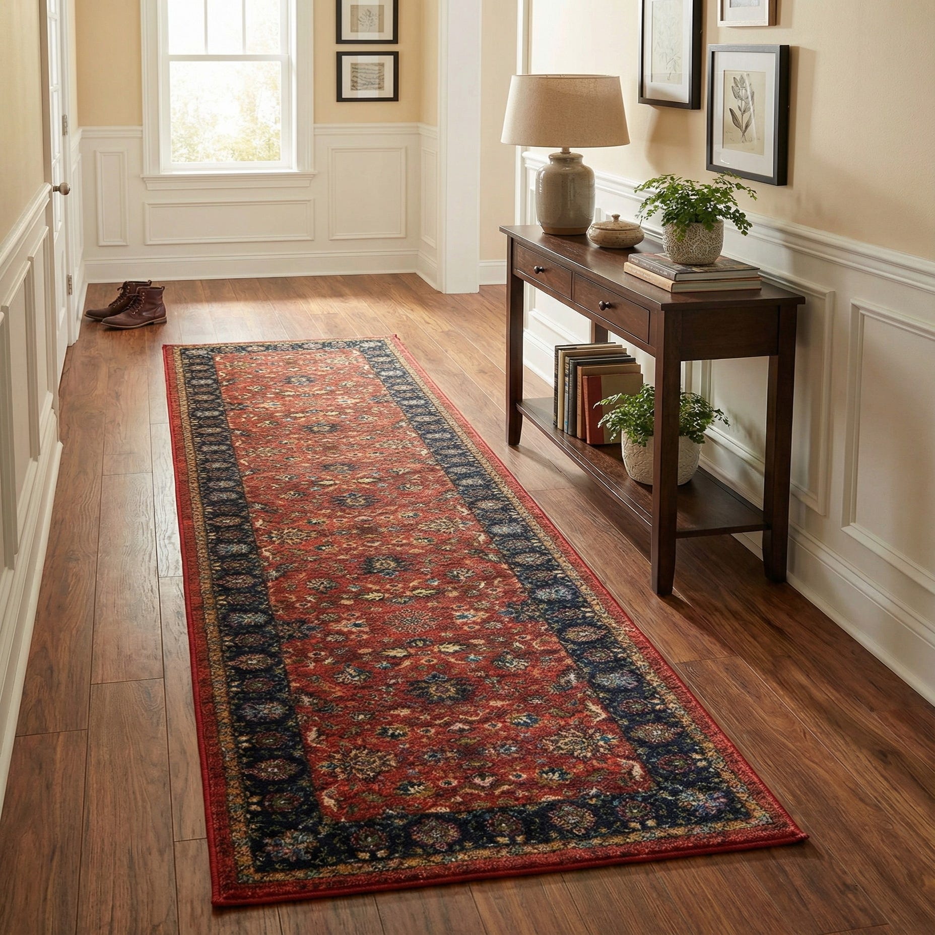 Machine-made of polyester, the surface is smooth and slightly plush, with a low to medium pile that holds the pattern crisply while feeling soft underfoot. Place it in a long entry or hallway to guide circulation, alongside a bed to add warmth and color, or in a kitchen corridor to anchor warm wood tones. It pairs well with dark wood furniture, brass or antique metal finishes, and solid navy or neutral upholstery for a cohesive, layered look.