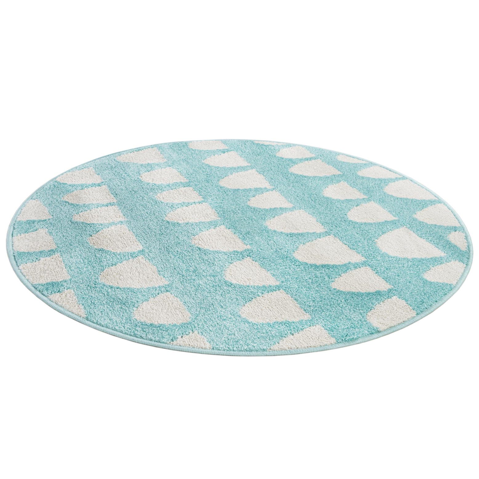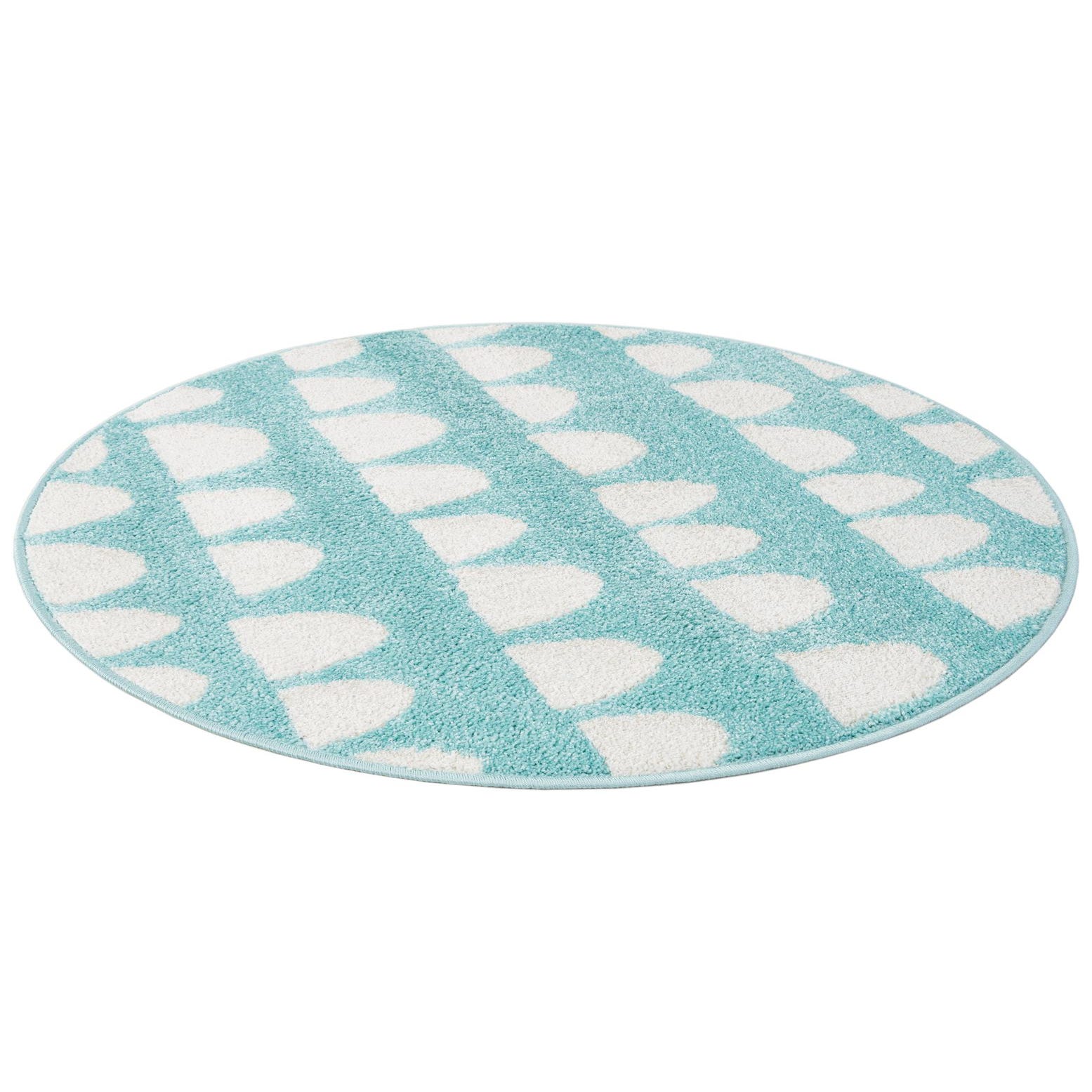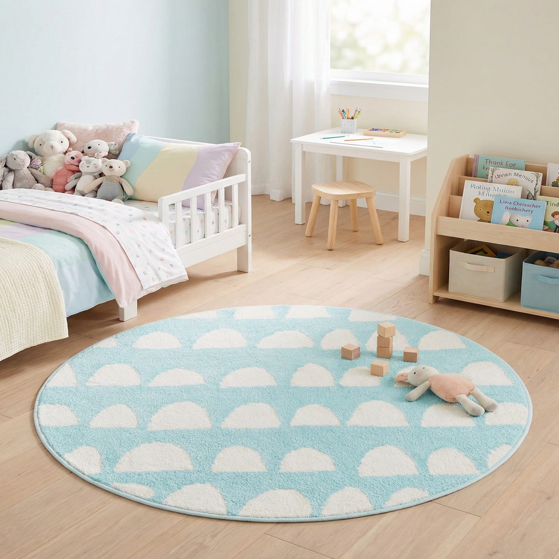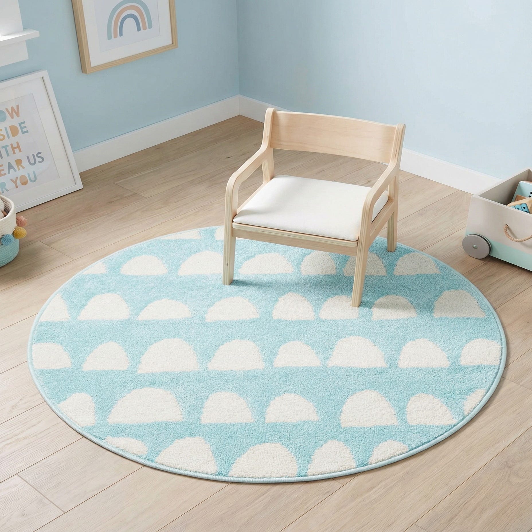This rug works well in a nursery or children's room, a light, coastal-inspired bedroom, or a bright play area—its round shape is perfect for anchoring a small seating cluster, a reading nook, or placement in front of a crib or toy storage. Pair it with white or pale-wood furniture and soft pastel accents for a coordinated, soothing palette, or set it against neutral floors to introduce a fresh pop of color and pattern.