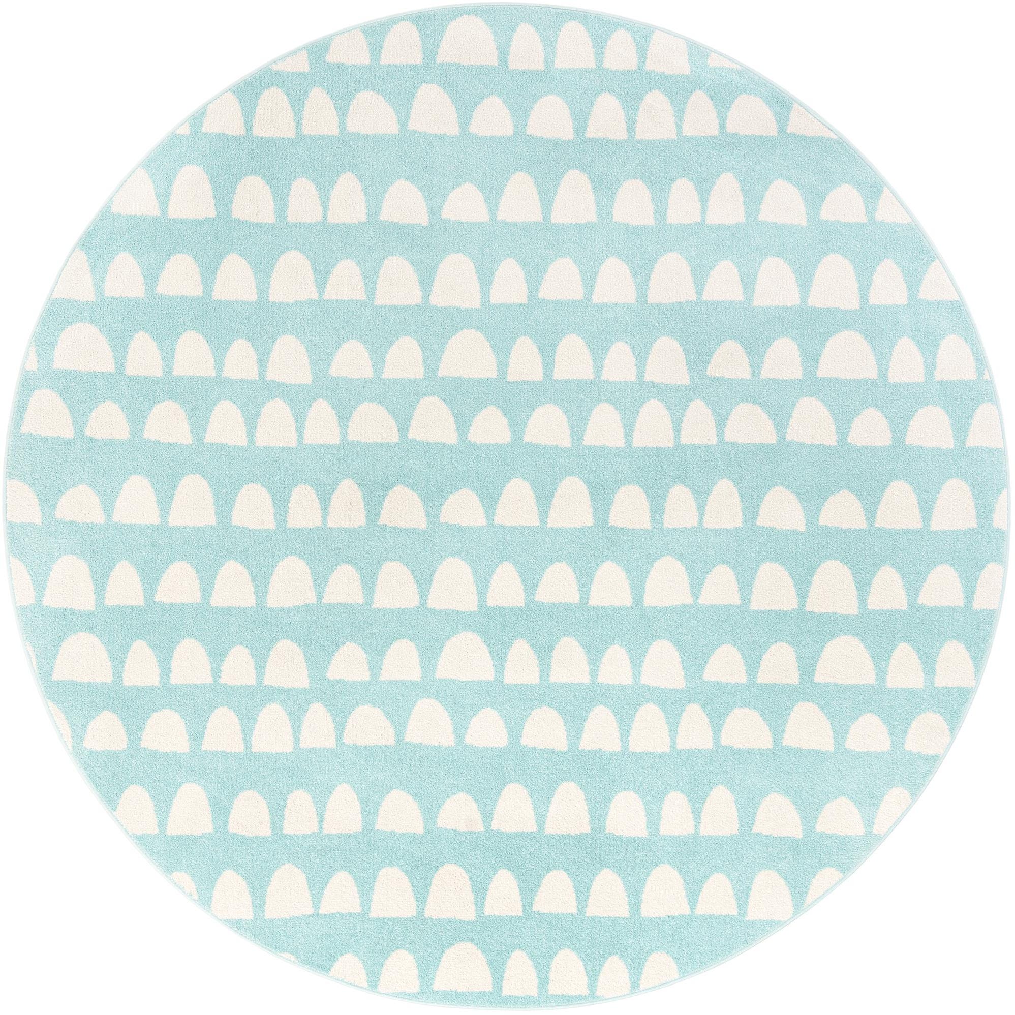A 7' 10 round clear blue rug with a playful abstract pattern of white half-moon shapes, suitable for a child's room.