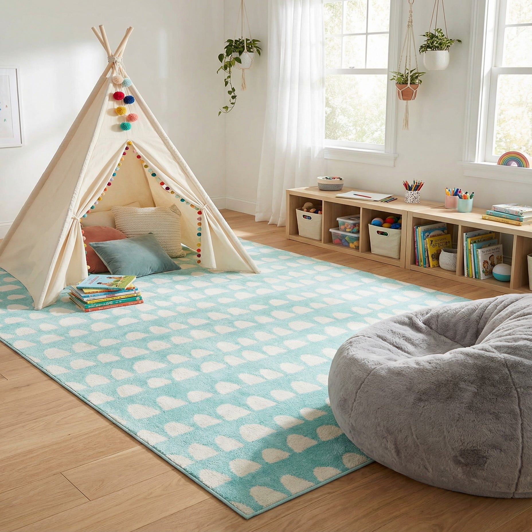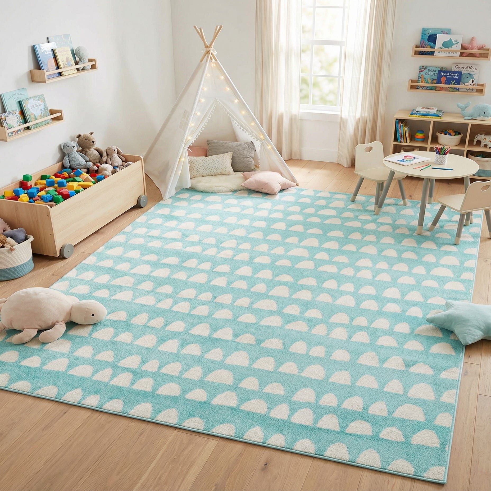 This rug works well in a child’s bedroom or nursery, brightening the floor beneath a reading nook or play area. It also suits casual coastal or contemporary interiors—try it under a low coffee table in a relaxed living room or layered beneath simple furniture to add a subtle, graphic touch.