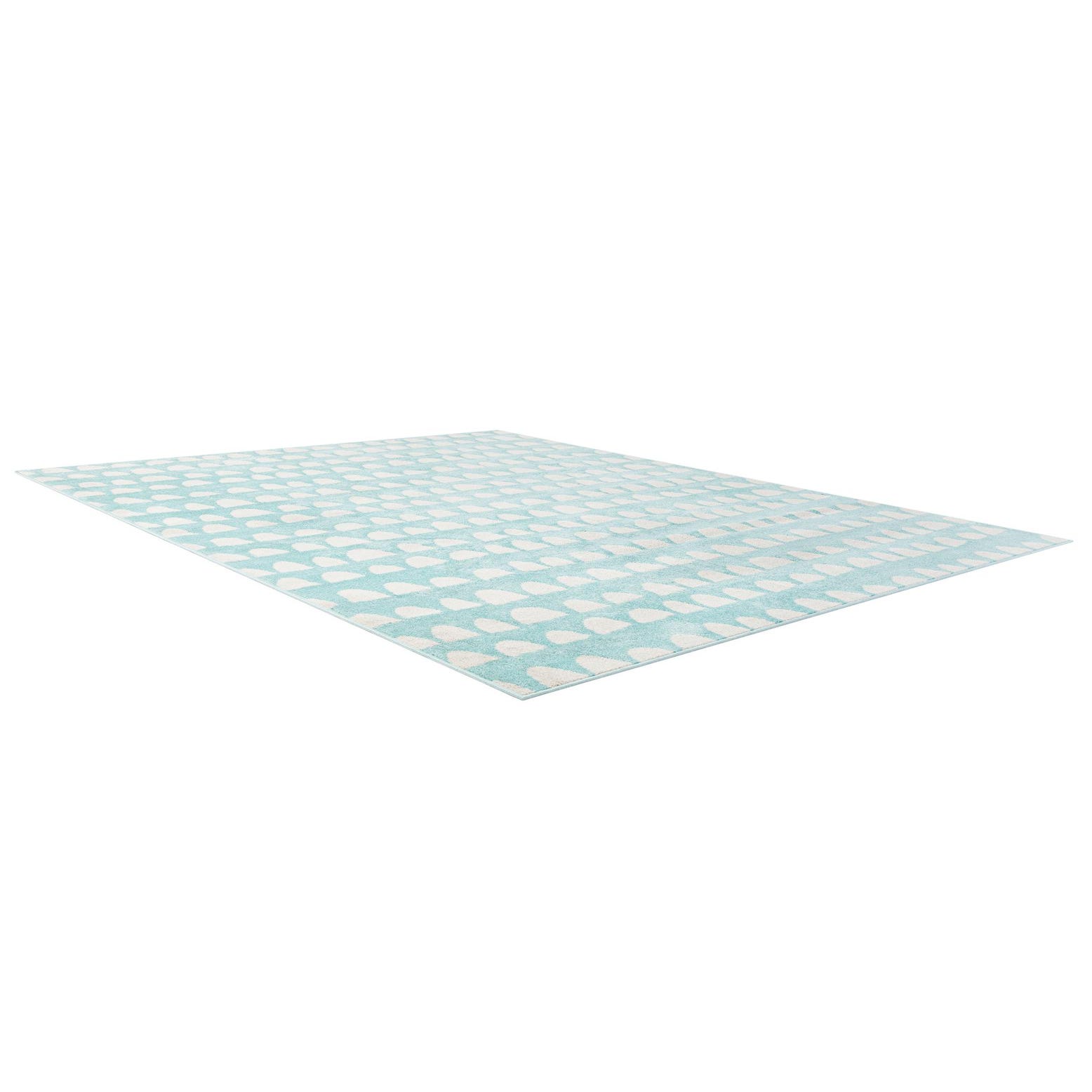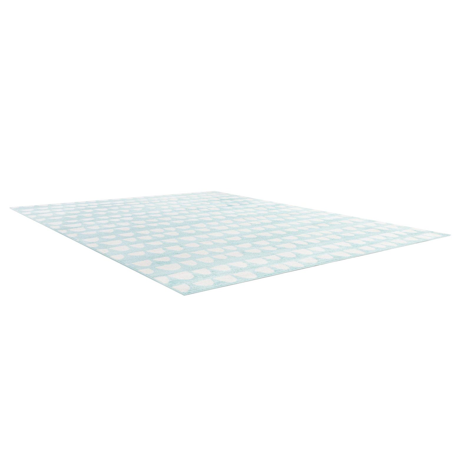 A rectangular 8x10 Clear Blue rug with a modern abstract pattern of white half-moon shapes, suitable for a child's bedroom or play area.