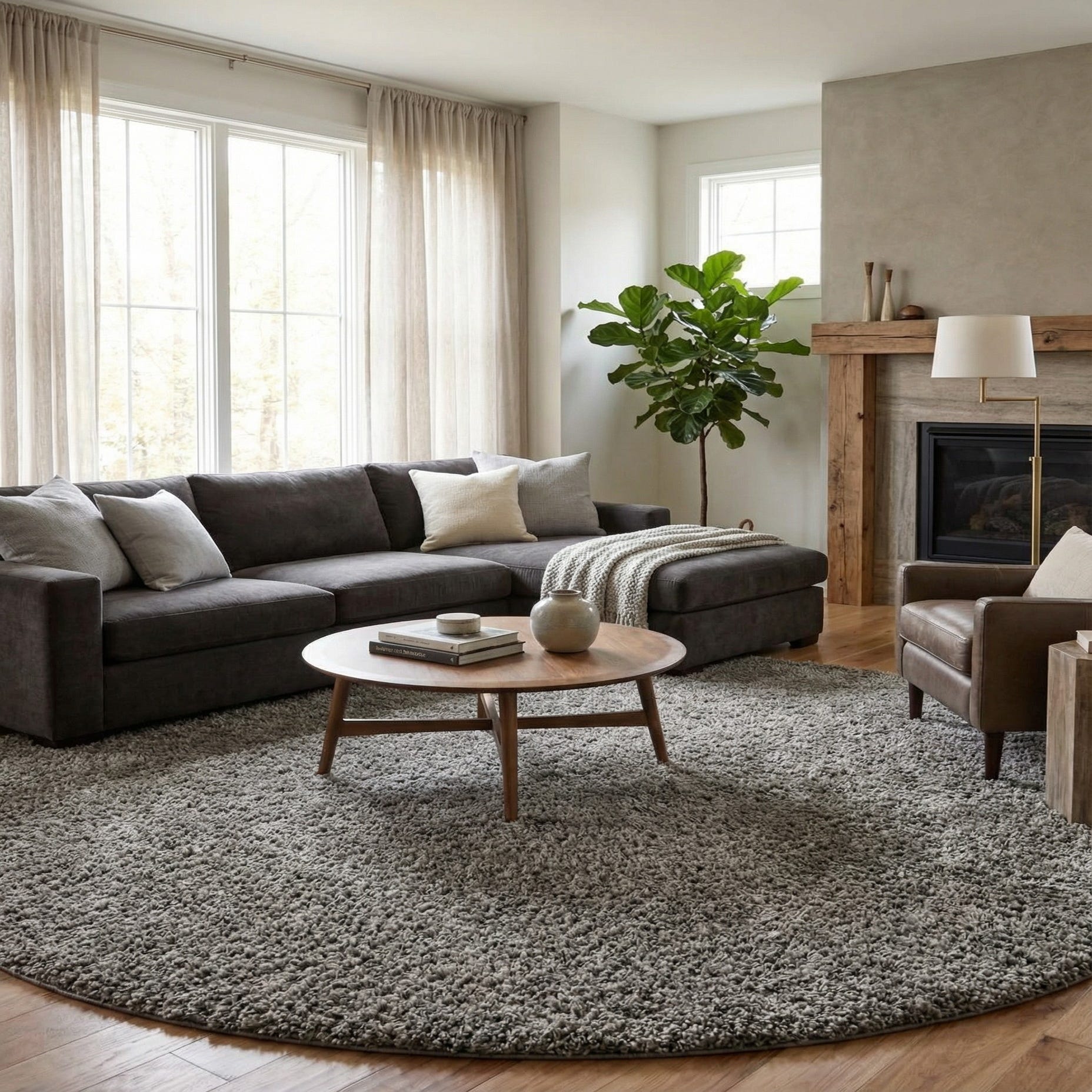 A round shag rug in Cloud Gray with a solid, tone-on-tone finish that keeps the look simple and versatile. Machine-made from 100% polypropylene, the dense high pile creates a plush, cushiony surface you can feel underfoot. The deep, uniform texture adds subtle visual depth while maintaining a clean, contemporary presence—no pattern, just soft, even color and a tactile, cozy pile.