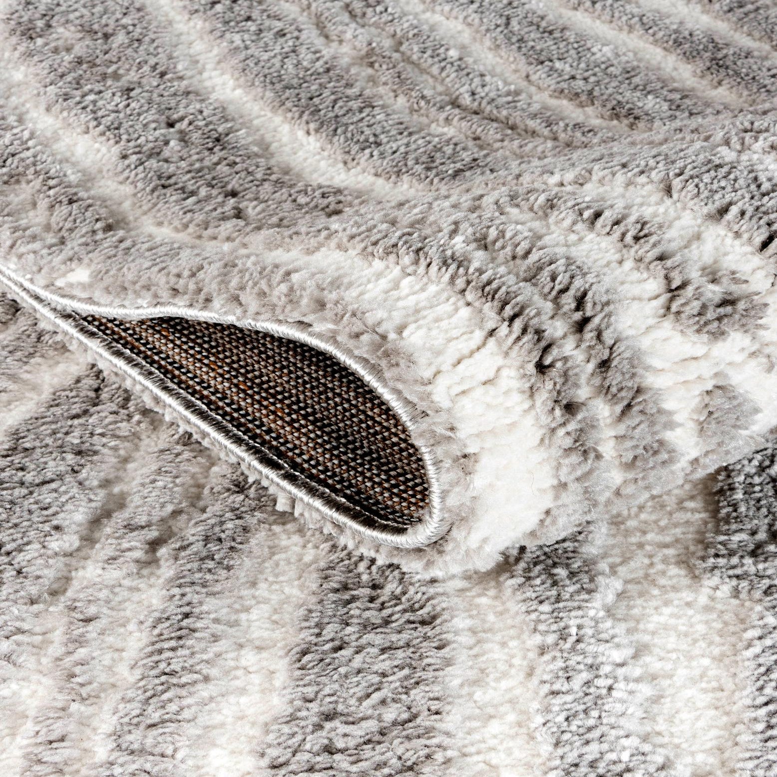 A 10 ft runner rug with a modern abstract pattern in varying shades of gray and silver, featuring a textured pile.