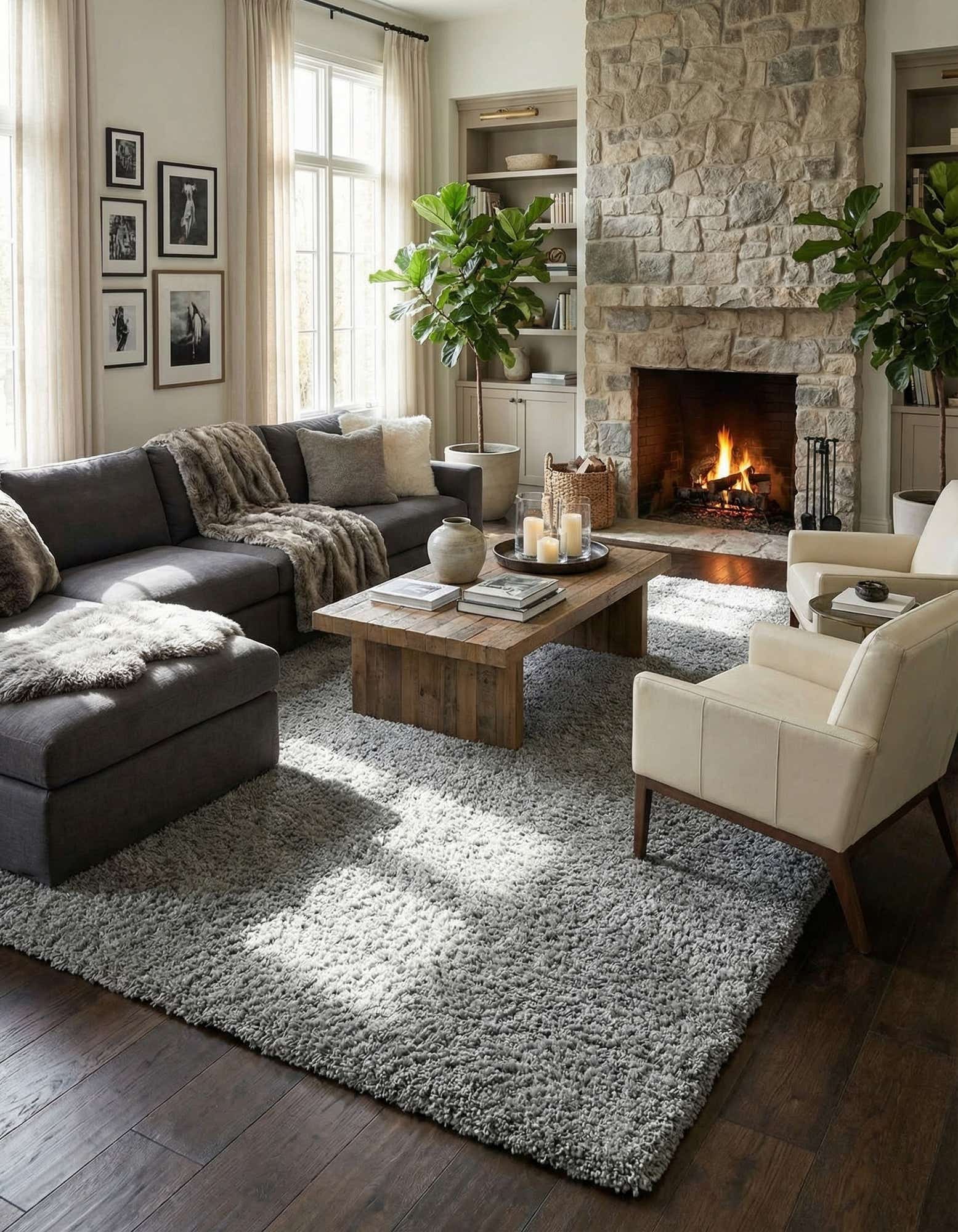 A large 10x13 rectangular gray shag rug with a soft, textured pile, perfect for a modern living room.