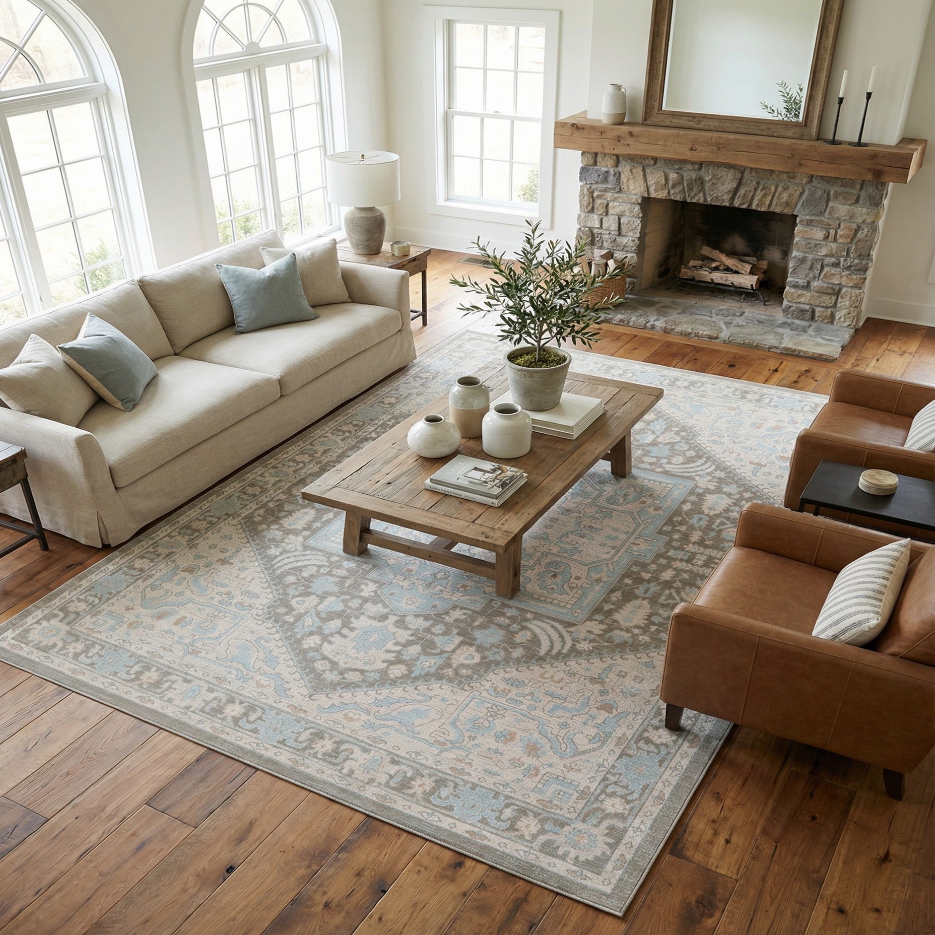 A classic medallion layout anchors this rug, with an octagonal central motif and a field of stylized florals and scrolling vine work that flow into layered borders. The background is Cloud Gray, while Ivory and Light Blue highlights trace the motif details and border accents, giving the design a softly antiqued, dimensional appearance. The overall effect is calm and understated, with enough pattern to define a room without dominating other elements.