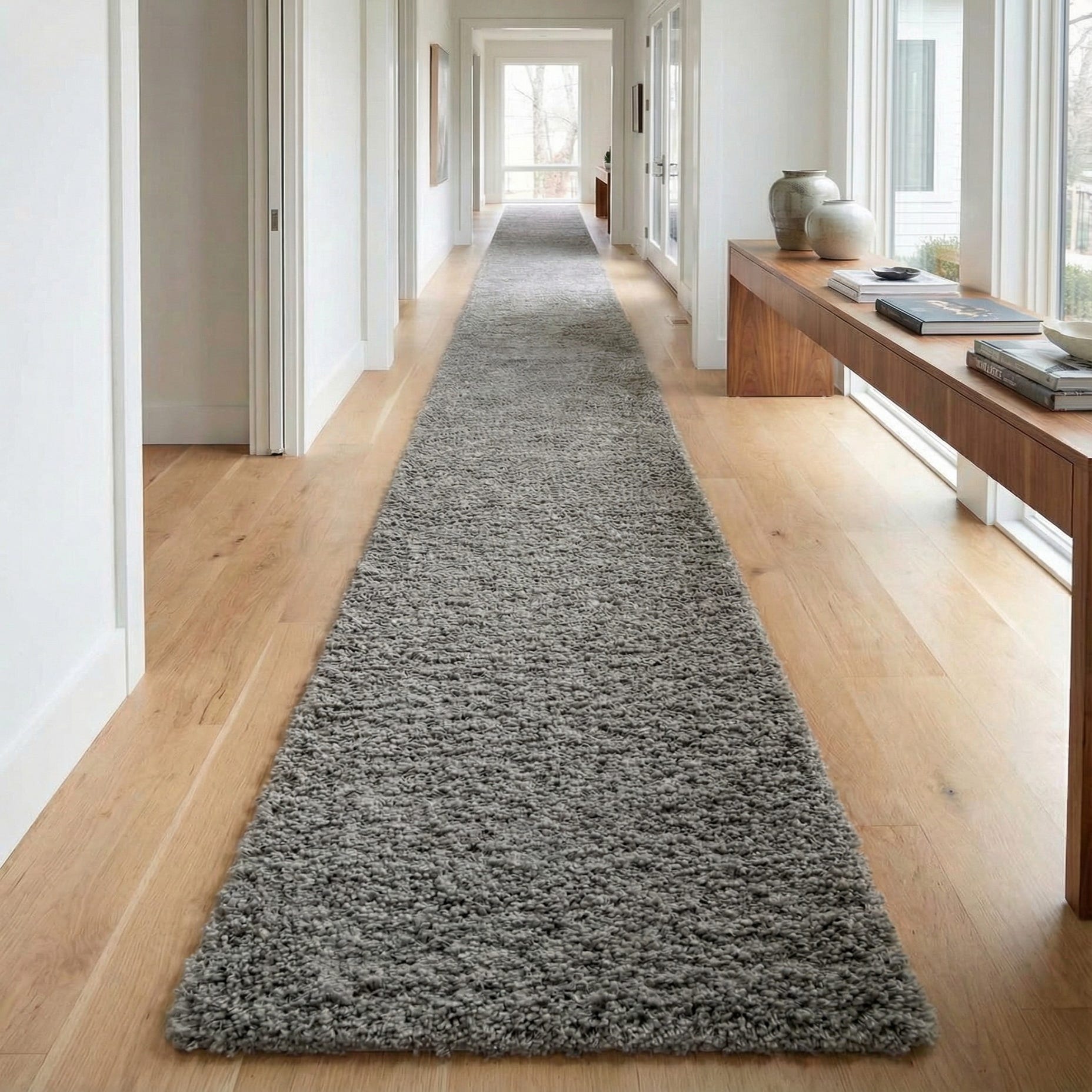 A long, rectangular 20 ft runner rug from the Rugs.com Solid Shag collection, featuring a thick, textured gray shag pile, ideal for a hallway.