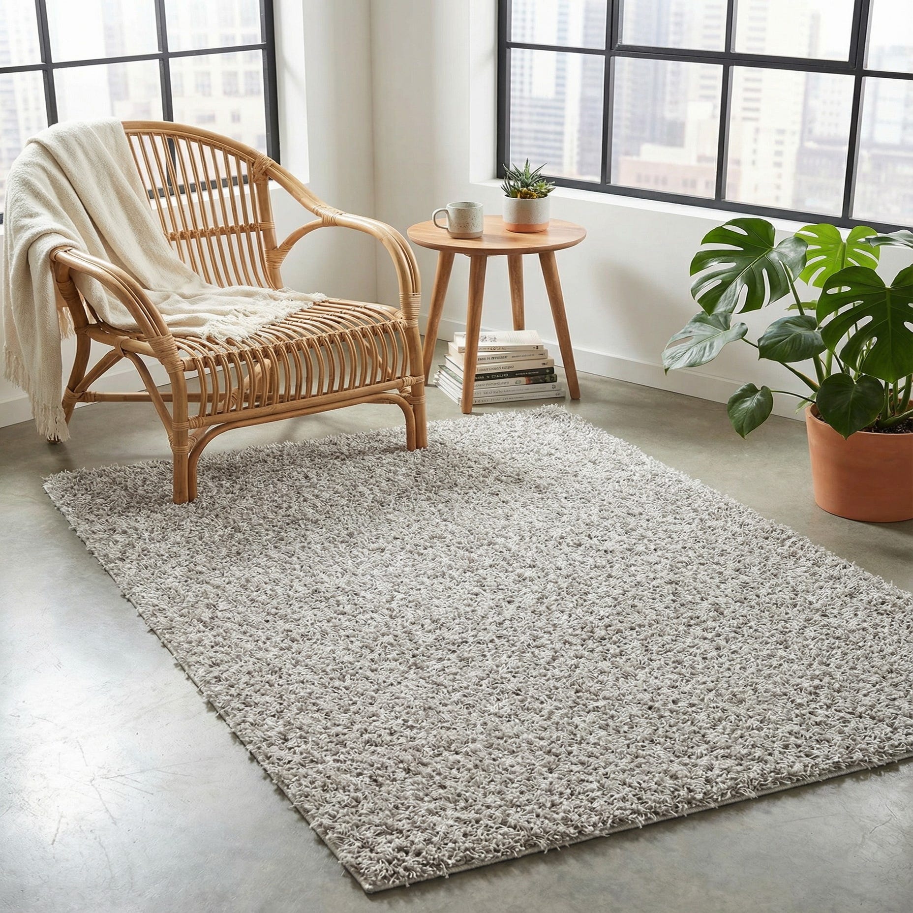 Cloud Gray provides a calm, neutral base across a solid shag surface that feels plush underfoot. Machine-made from 100% polypropylene, the long, dense pile has a soft, slightly lustrous finish and a tactile, cushiony quality when you press your hand into it. The single-color field keeps the look simple while the shag texture adds visual depth and a relaxed, inviting feel.