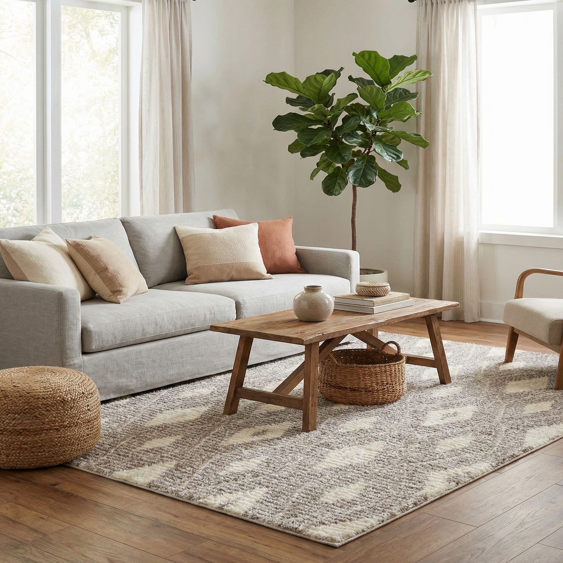 This neutral palette and modern-geometric style work well in contemporary, Scandinavian, or transitional rooms. Place it under a sofa and coffee table to anchor a living area, layer it at the foot of a bed to add a soft touch to a bedroom, or use it in a home office to define a seating nook. Pair with light woods, ivory or gray upholstery, and textured textiles for a calm, collected look.