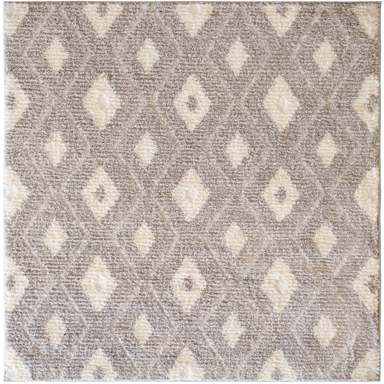 A geometric diamond pattern in ivory sits against a Cloud Gray ground, forming a repeating lattice of elongated diamonds and smaller inner lozenges. The design uses a subtle high-low texture so the ivory motifs lift slightly above the gray background, creating gentle shadow and depth. Machine-made of polypropylene and polyester, the surface has a soft, slightly plush hand with a low-to-medium pile that feels comfortable underfoot while keeping the pattern clean and defined.