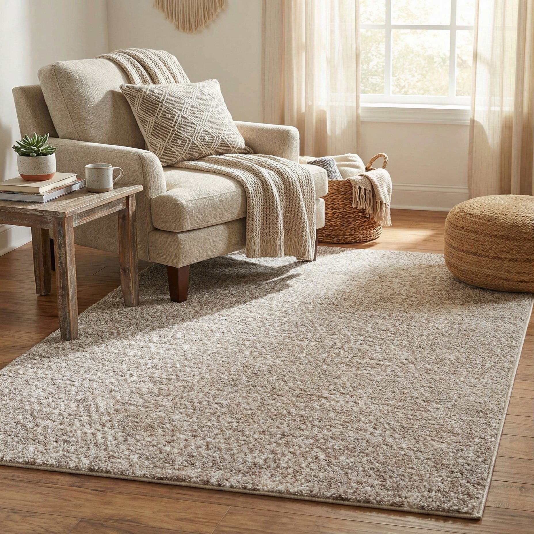 This rug suits a range of interiors that favor a restrained, layered aesthetic. Place it in a living room beneath a low-profile sofa and coffee table for a relaxed, contemporary arrangement, or use it in a bedroom to add soft texture at the foot of the bed. It also works well in Scandinavian, transitional, or minimalist schemes where neutral tones and tactile surfaces anchor the room—pair with light wood, matte metal accents, and soft linens for a cohesive look.