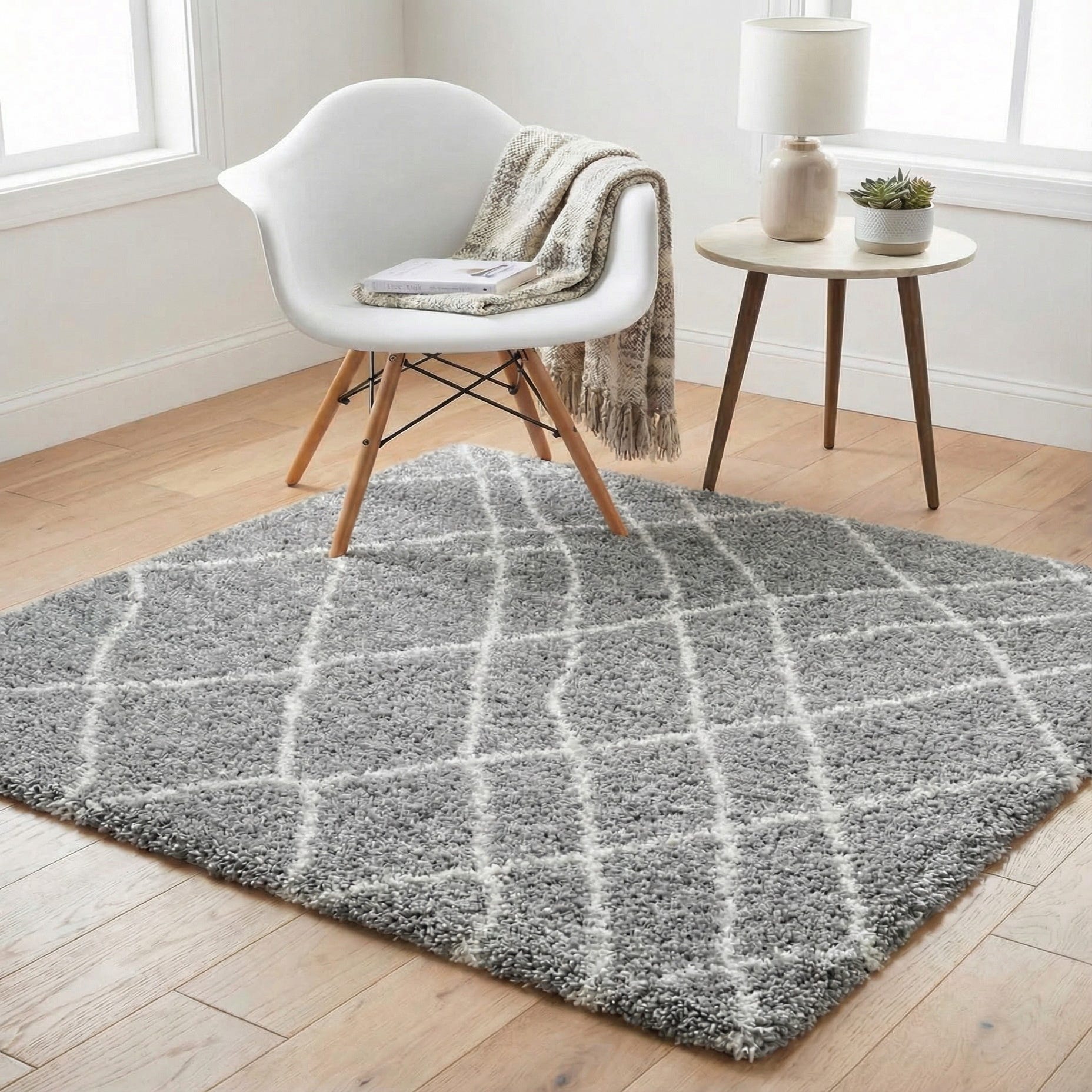 A soft gray square shag rug with a white geometric diamond pattern, ideal for a modern living space.