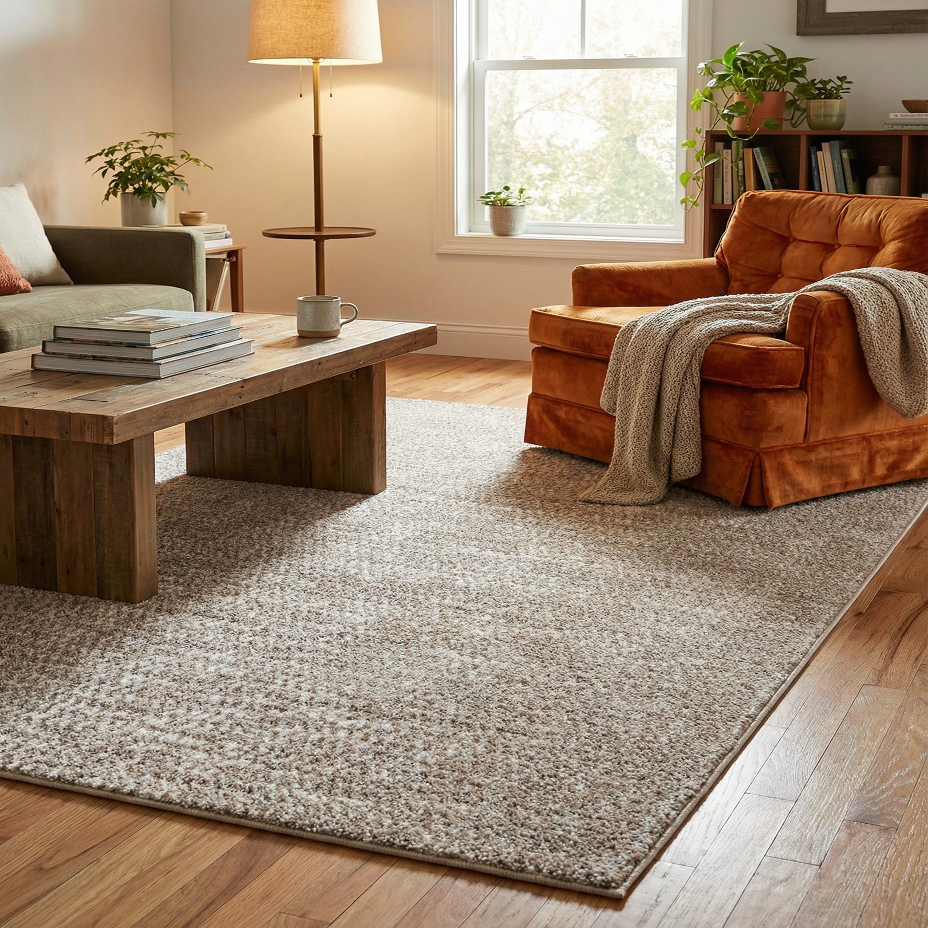 Well-suited to contemporary and transitional interiors, this rug anchors a seating area or layers comfortably under a coffee table, and it brings warmth to a bedroom or home office. Pair it with light wood furnishings and neutral linens for a Scandinavian or coastal look, or use it to soften industrial finishes like metal and concrete for a balanced contrast. Ivory accents and textured throws complement the Cloud Gray ground for a calm, cohesive palette.