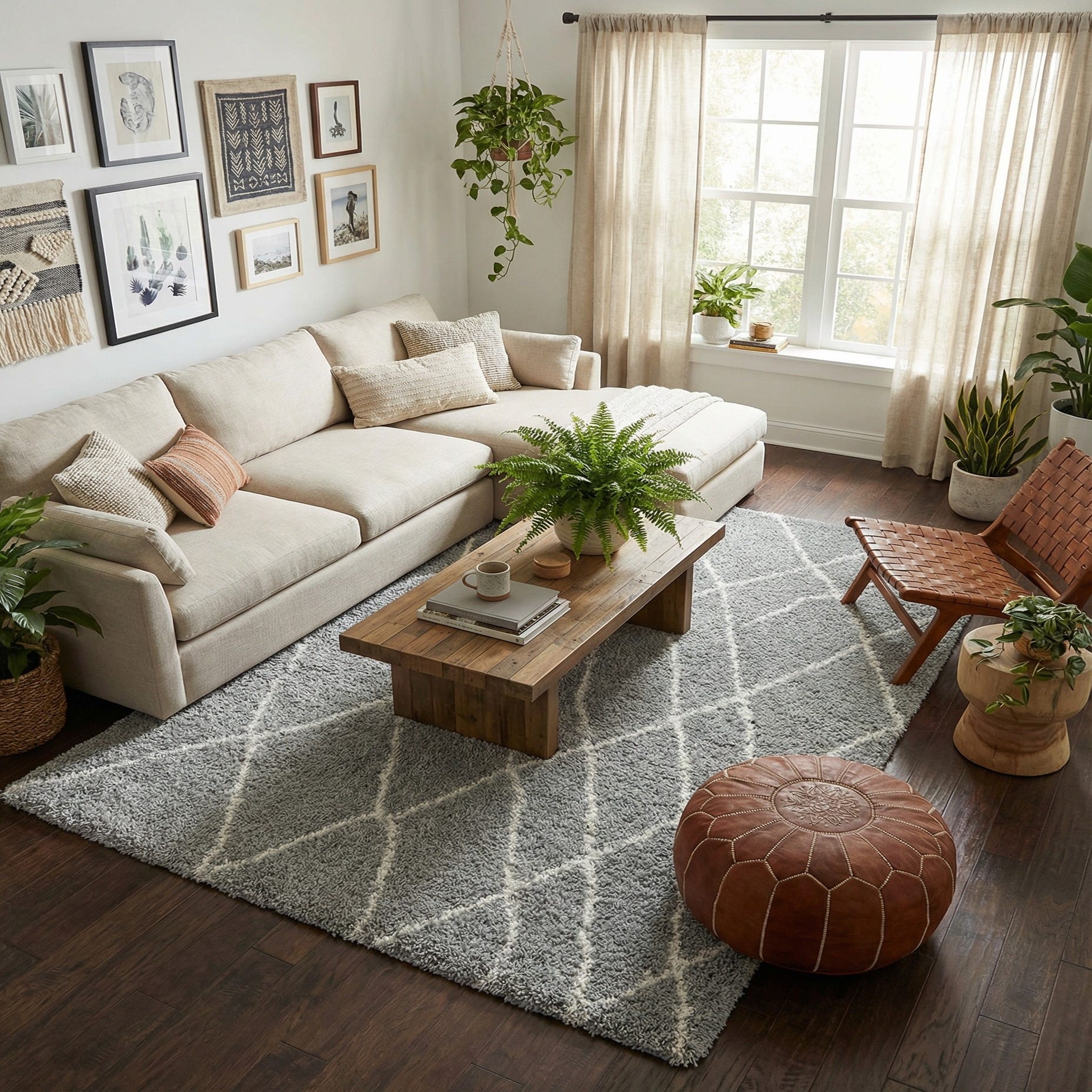 Works well layered over hardwood or tile to warm a living room seating area, tucked under a coffee table to define a casual conversation zone, or placed beside the bed for a soft landing in the morning. The neutral cloud gray and ivory palette complements Scandinavian, modern farmhouse, and transitional interiors, and pairs nicely with light wood finishes, linen upholstery, and matte metal accents.