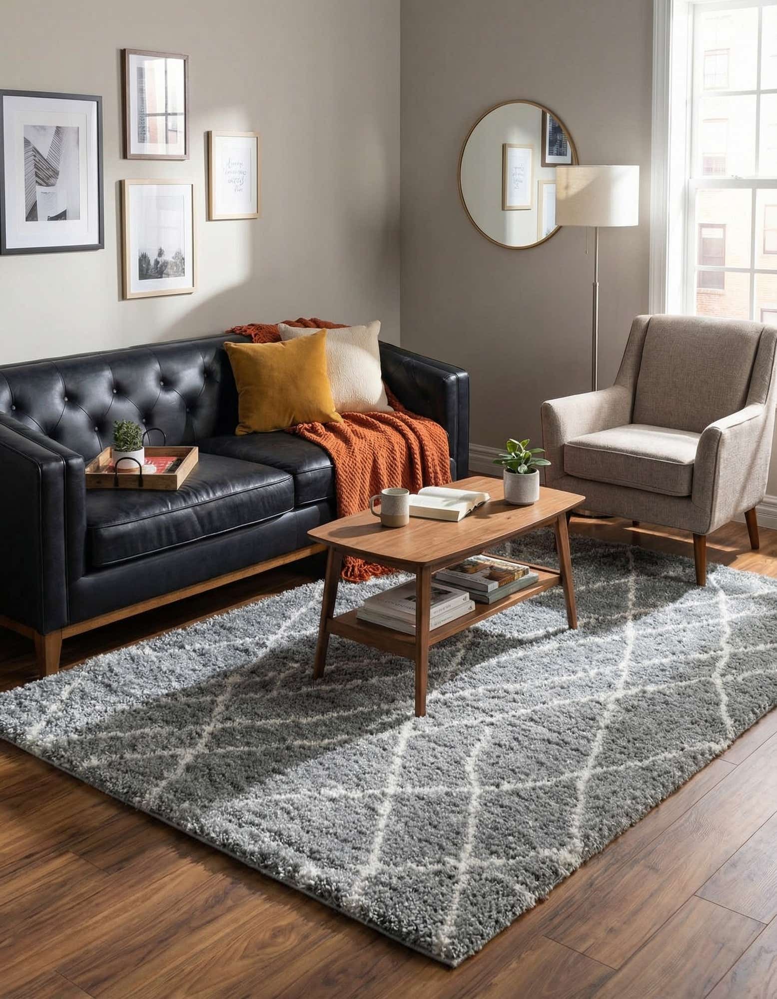 A 5x8 rectangular gray shag rug with a white geometric diamond pattern, ideal for a modern living room.