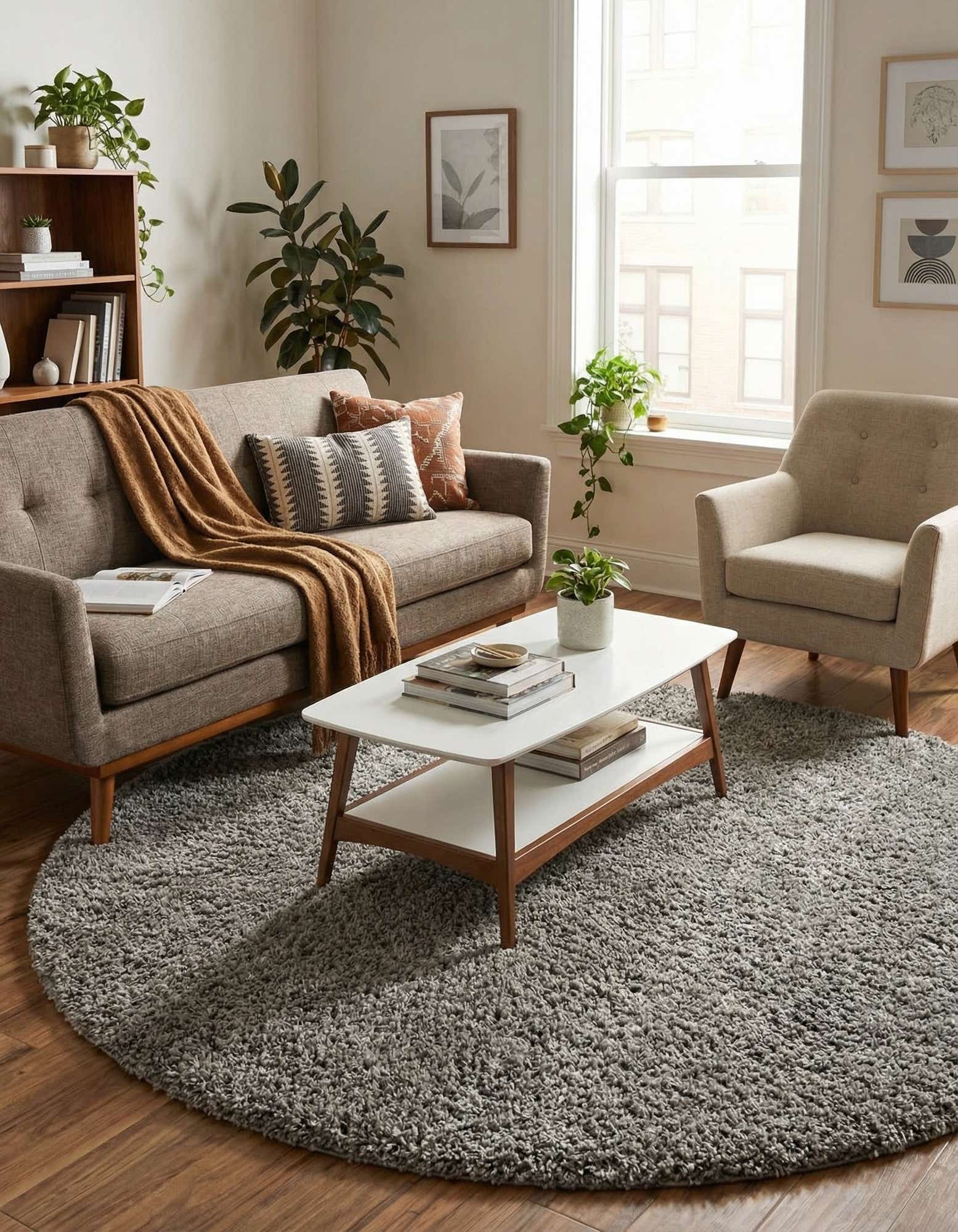 A plush, round shag rug in a Cloud Gray tone, this piece offers a solid, textured surface with the soft depth that a cut shag pile creates. Machine-made from 100% polypropylene, the dense fibers have a gentle sheen and a springy hand underfoot, giving the rug a tactile, inviting feel without any printed pattern—just a clean, monochromatic surface that anchors a room with quiet neutrality.