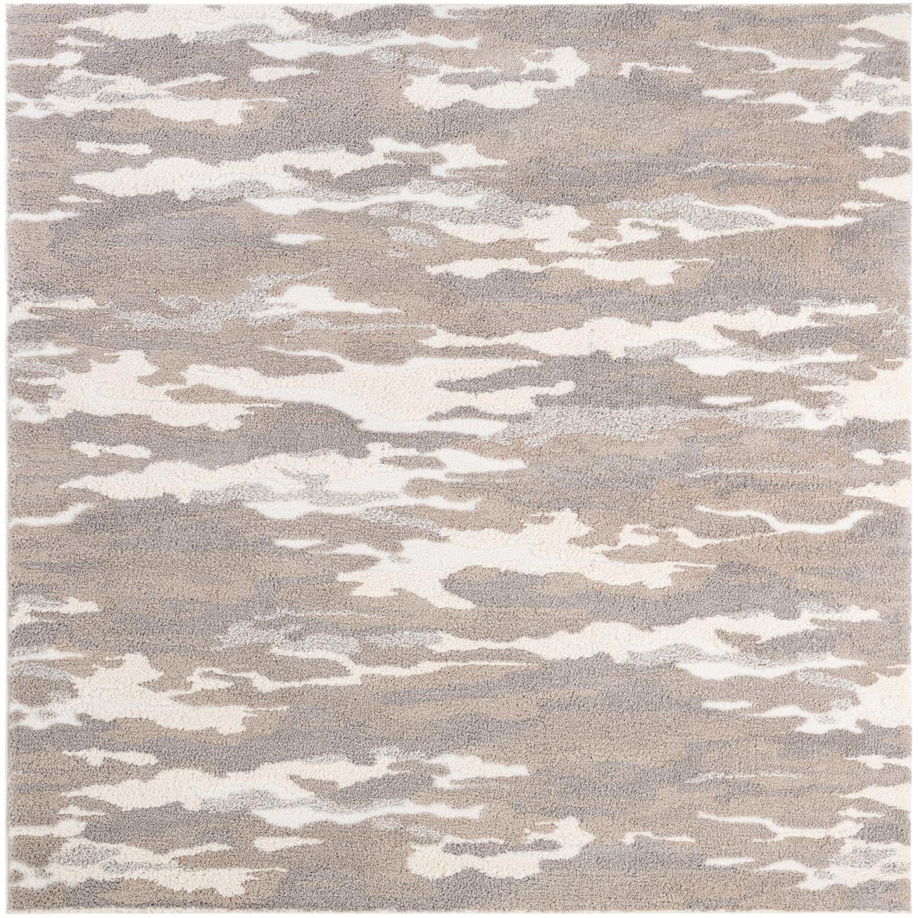 An abstract, cloud-like pattern drifts across a Cloud Gray background in soft layers of Beige and Ivory, offering a calm, tonal look with gentle movement. The organic shapes lend a contemporary, relaxed style that works well in modern and transitional interiors. Machine-made from polypropylene and polyester, the cut-pile surface feels soft and cushioned underfoot, with a subtle sheen that highlights the layered pattern and gives the rug a tactile depth.