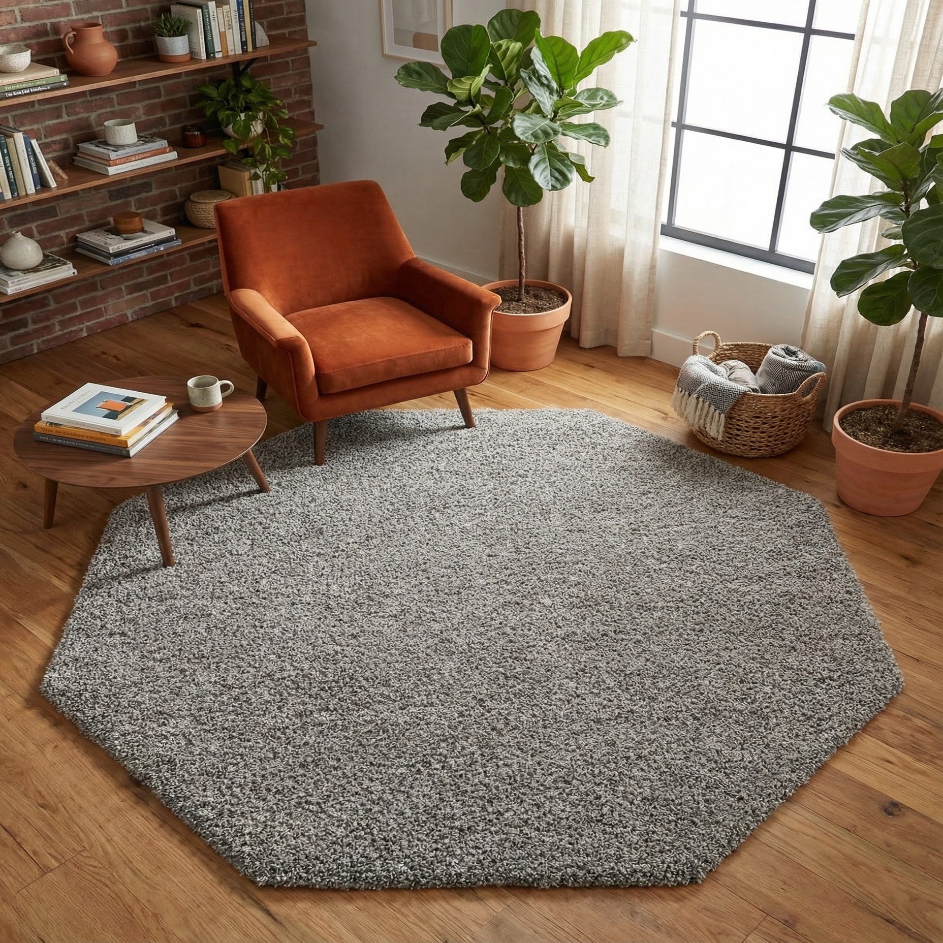 A soft, plush 7' 10 x 7' 10 octagon shag rug in a solid gray color, ideal for a modern living space.