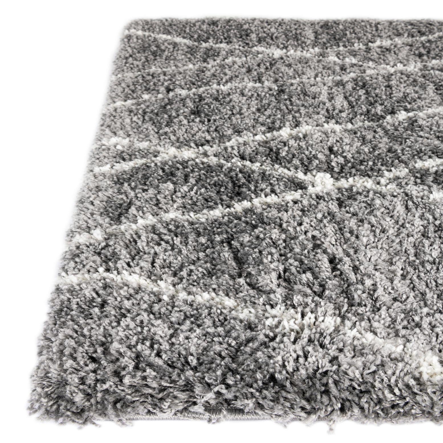A square 7' 10 x 7' 10 gray shag rug with a white diamond trellis pattern, offering a soft, textured feel.