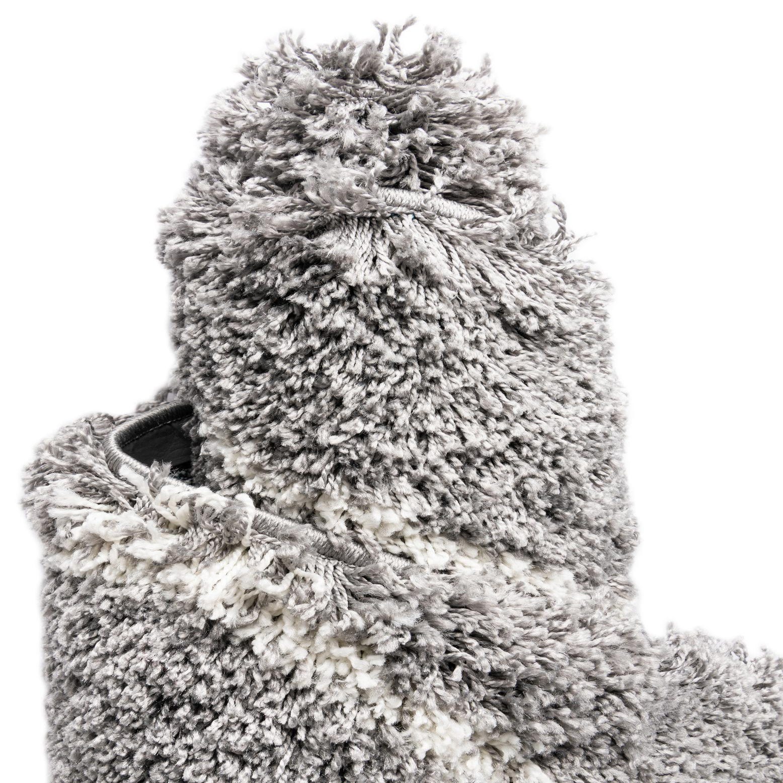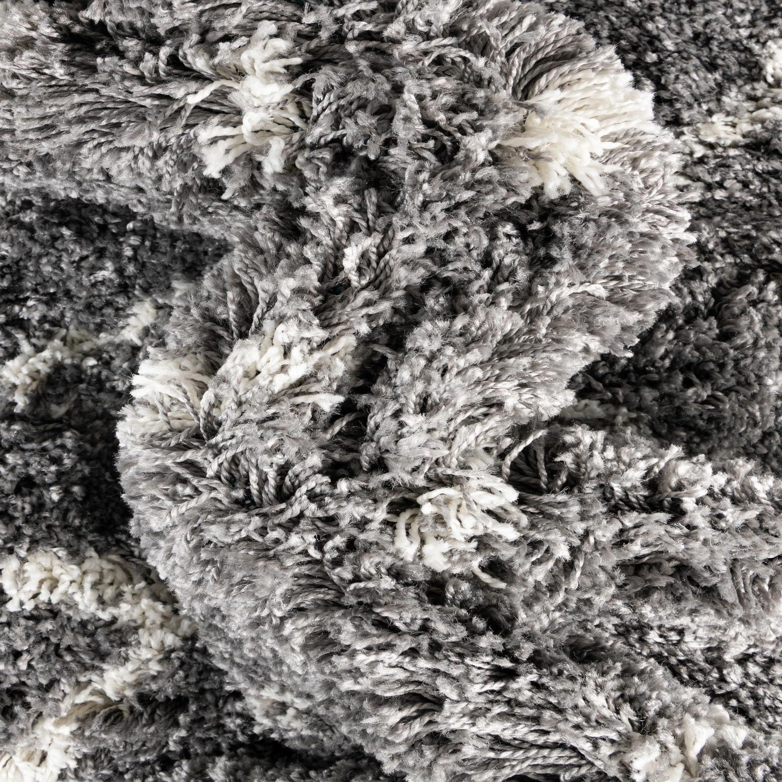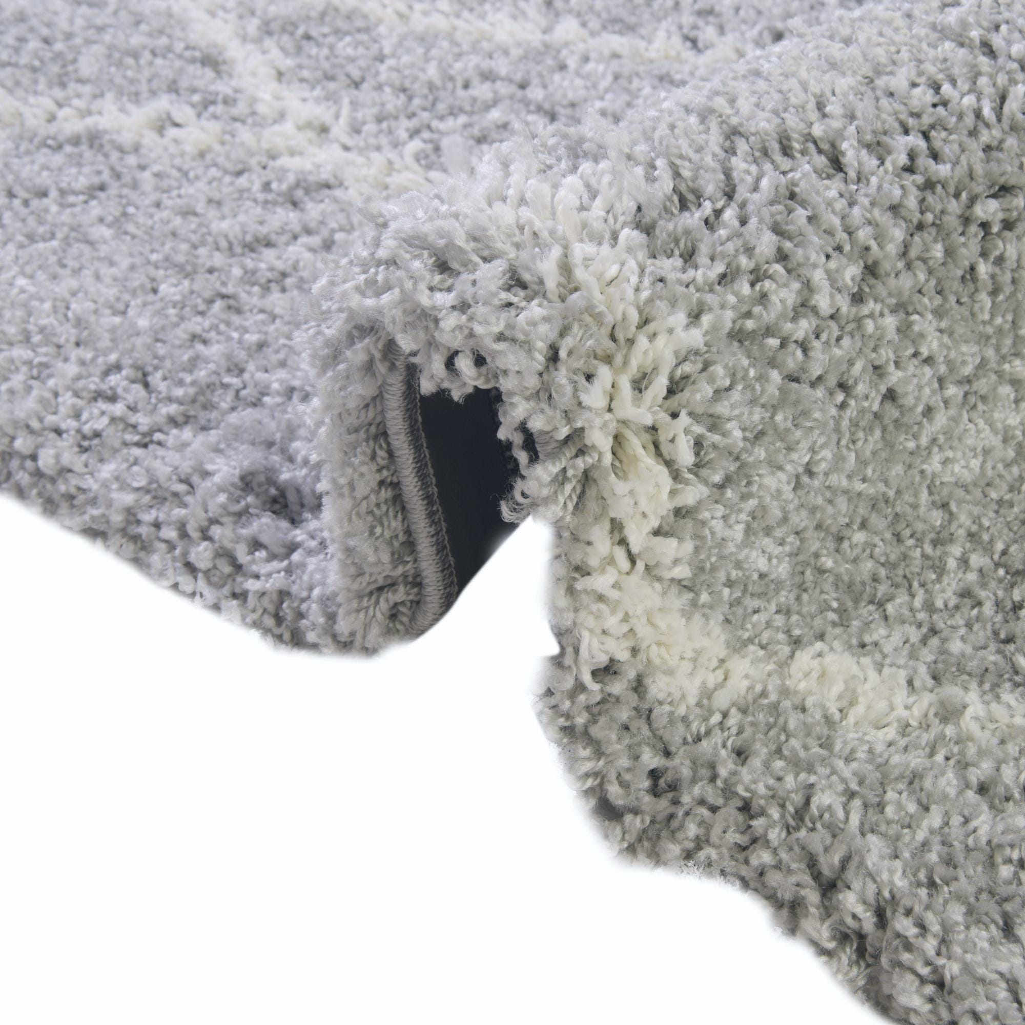 Plush cloud gray pile forms the backdrop for an ivory, hand-drawn trellis pattern that brings geometric interest without overpowering a room. The shag surface feels soft and dense underfoot, while the slightly lofted ivory lines create a gentle, low-relief texture that adds depth and movement to the design. The overall effect is modern with a relaxed, tactile quality.