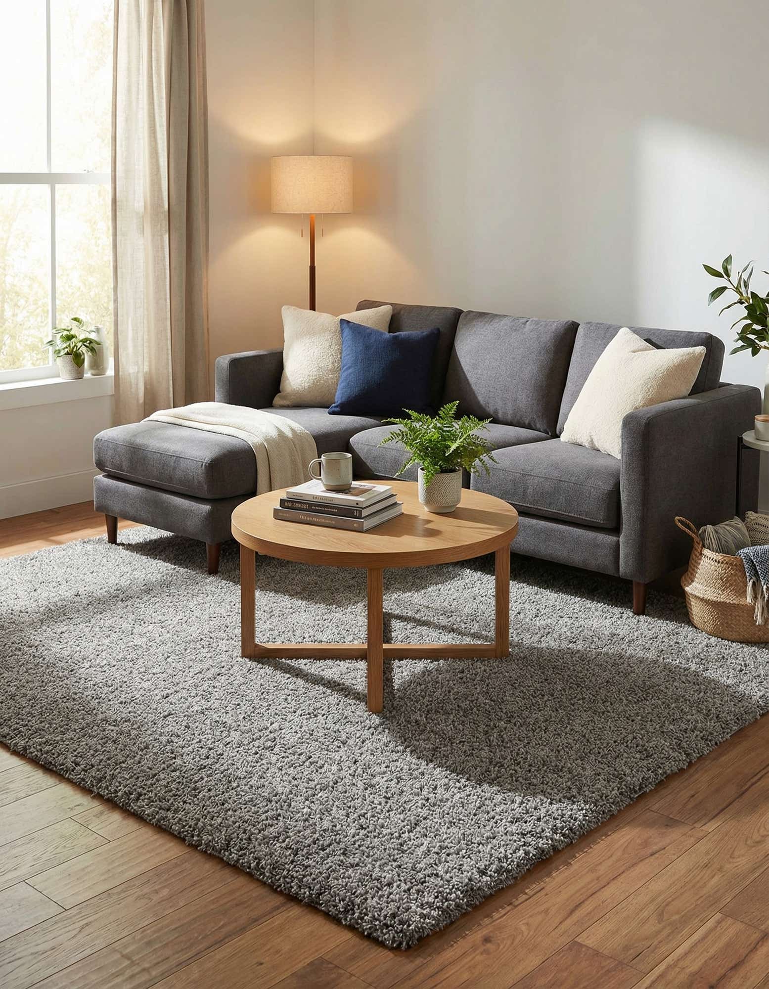A soft, single-color shag with a uniform field in Cloud Gray, this rug offers a simple, modern look with tactile warmth. The dense, plush pile formed by long polypropylene fibers produces a cushioned feel underfoot and a gently textured surface that catches light without pattern interruption. Its monochromatic design keeps the room visually calm while adding a cozy layer of texture.