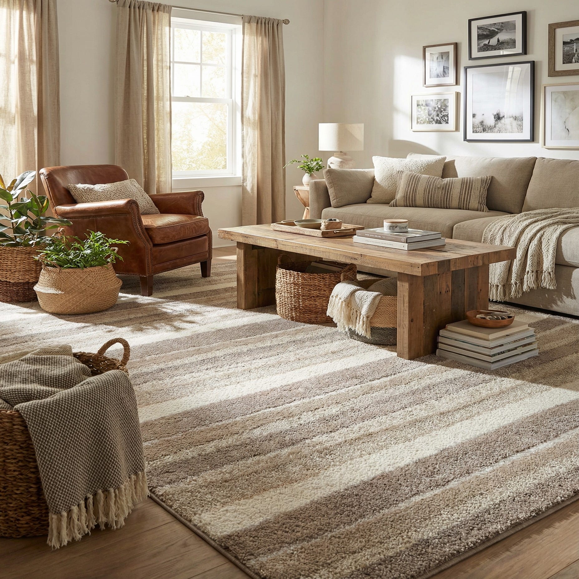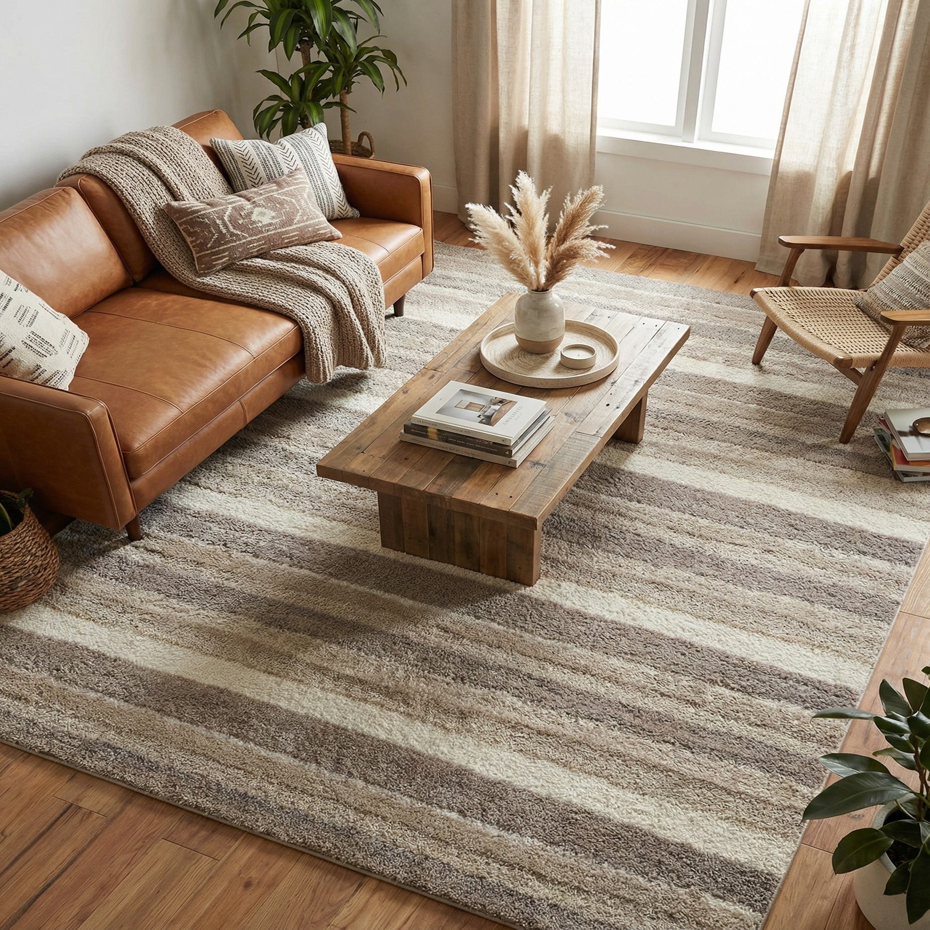 The calm, neutral palette and linear motif make this rug a natural anchor for seating areas and bedrooms. Use it beneath a sofa and coffee table to define a living room, place it under the lower two-thirds of a bed to add warmth, or layer it on hardwoods in a home office for added softness. It pairs well with light wood furniture and linen upholstery for a Scandinavian or coastal look, and complements matte black metal accents and textured textiles in a modern transitional setting.