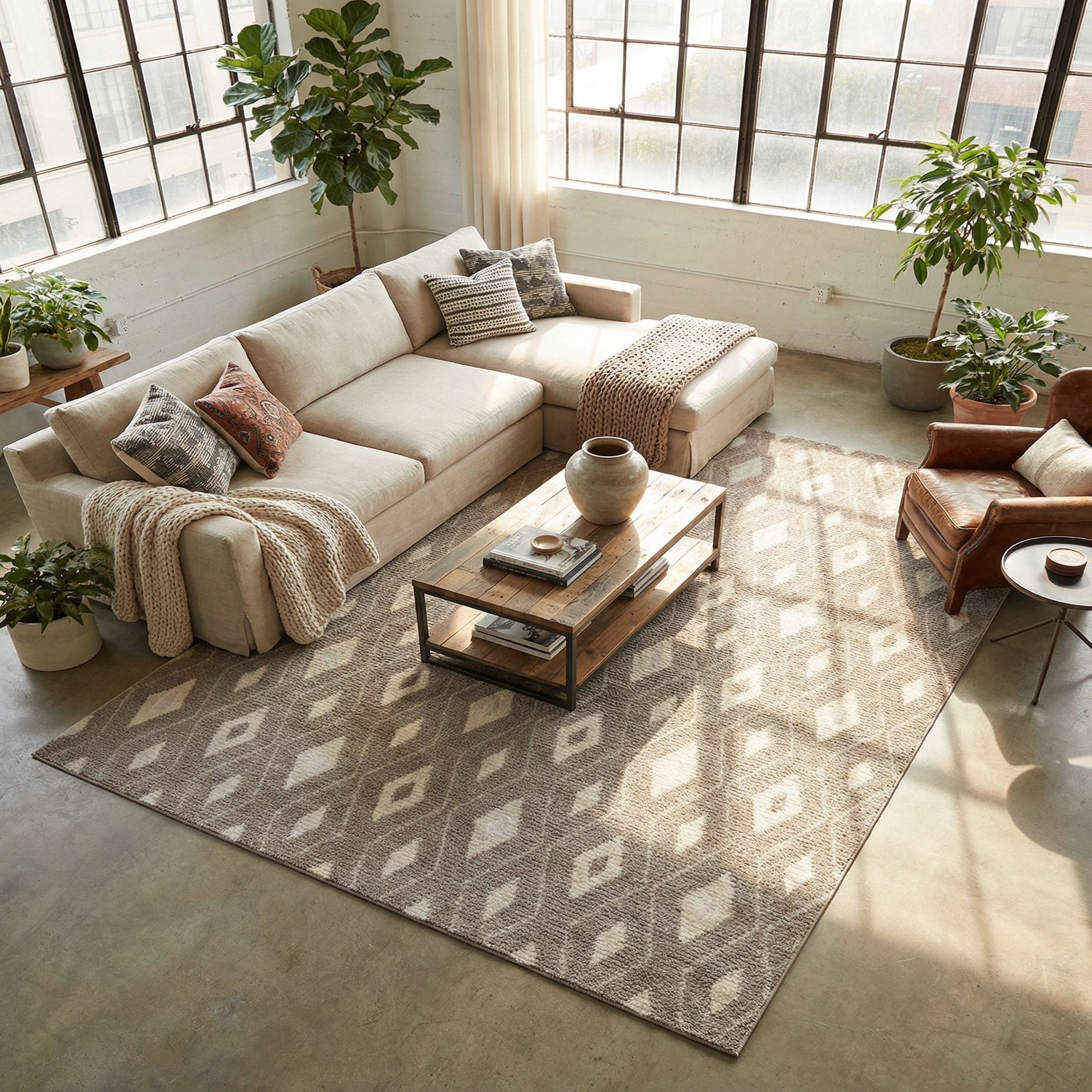 Machine-made of polypropylene and polyester, the rug has a smooth, low-pile hand that feels comfortable underfoot while maintaining clear pattern definition. Its neutral palette and graphic motif work well in contemporary living rooms, a light-filled bedroom, or an entryway where you want pattern without heavy color. Pair it with natural wood finishes and soft linens for a Scandinavian-inspired scheme, or layer it beneath a streamlined sofa and metal-accent furniture for a clean, transitional look.
