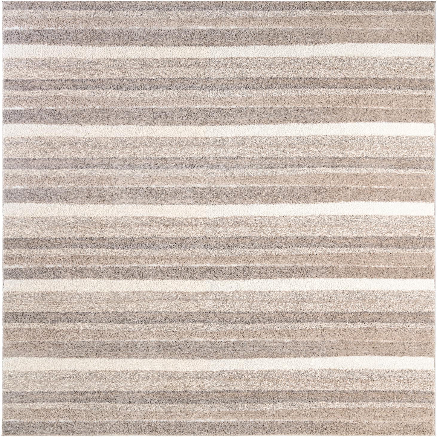 Soft, striated bands run across a cloud-gray ground in a relaxed, painterly stripe that feels both modern and understated. Brushlike lines of beige and ivory layer over the background, creating subtle tonal movement and visual depth without heavy contrast. The surface reads plush and inviting to the touch, with varied yarn heights that give the pattern a gentle, tactile quality. Machine made from polypropylene and polyester, the rug has a soft hand and a slight sheen from the polyester fibers.
