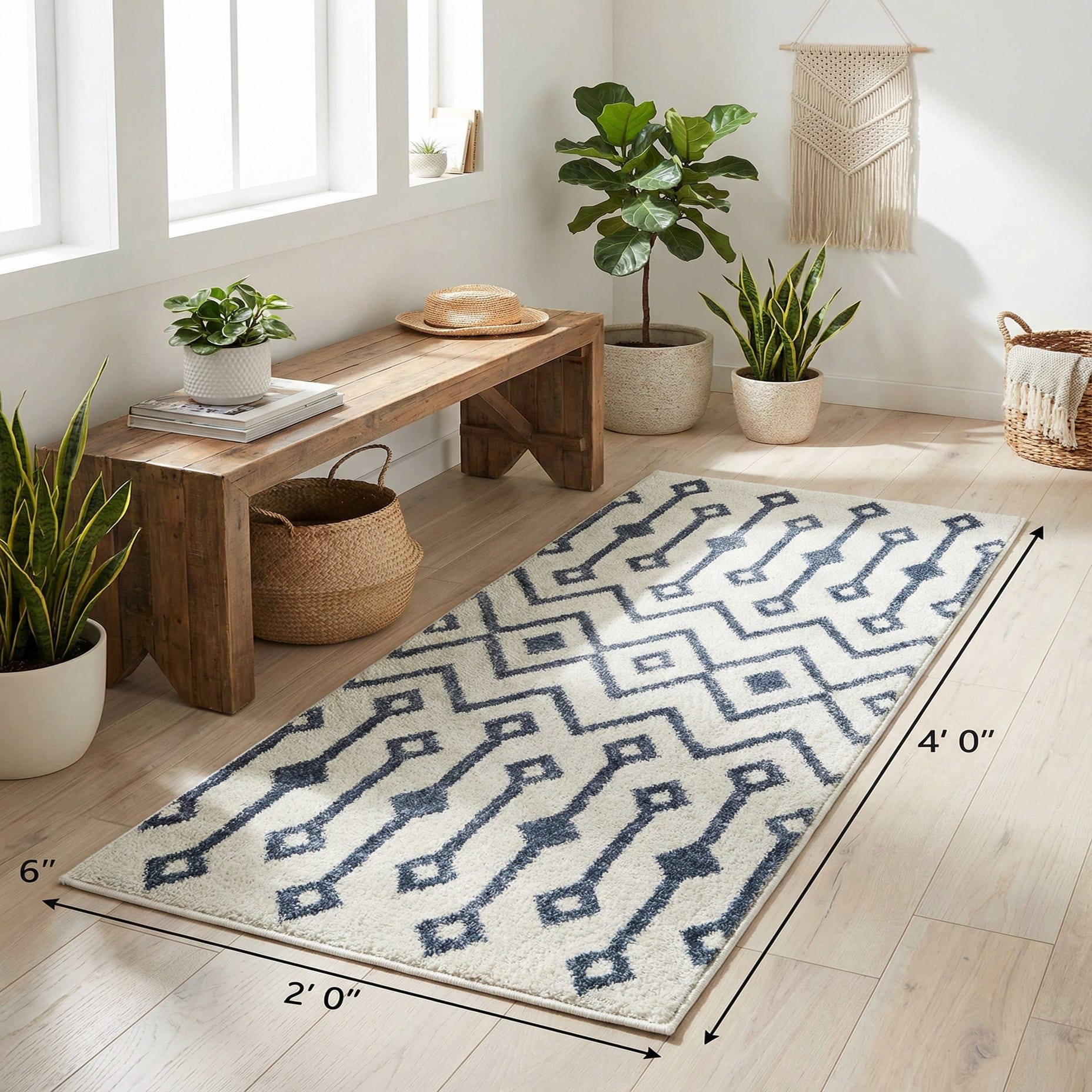 This runner works well in narrow, high-traffic areas such as entryways, hallways, and alongside a bed, where the pattern can visually lengthen the space. It pairs naturally with coastal, modern farmhouse, or relaxed contemporary interiors—think white-washed or natural wood floors, navy accents, and light linen upholstery. Use it to introduce pattern into a minimalist space or to ground layered textiles in a casual, bohemian-inspired room.