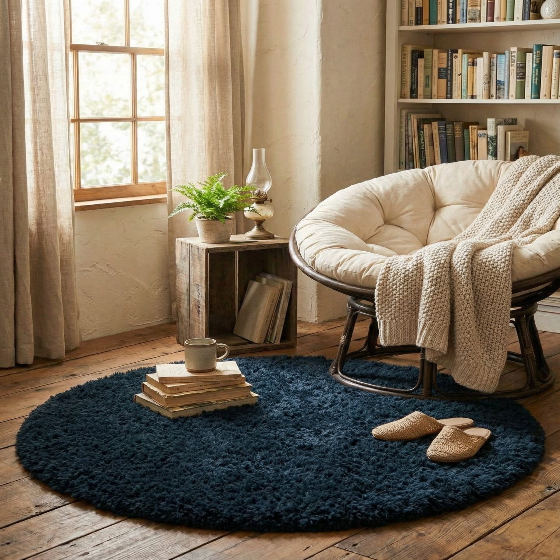 Place this rug beside a bed, in a reading nook, or under a small round table to add a concentrated area of color and softness. It pairs well with light neutrals, warm wood tones, and metallic accents in contemporary, mid-century, or coastal-inspired interiors, and works equally well layered over a larger neutral rug to define a cozy zone. The polyester pile retains its fullness and color, making it a practical choice where comfort and color are important.
