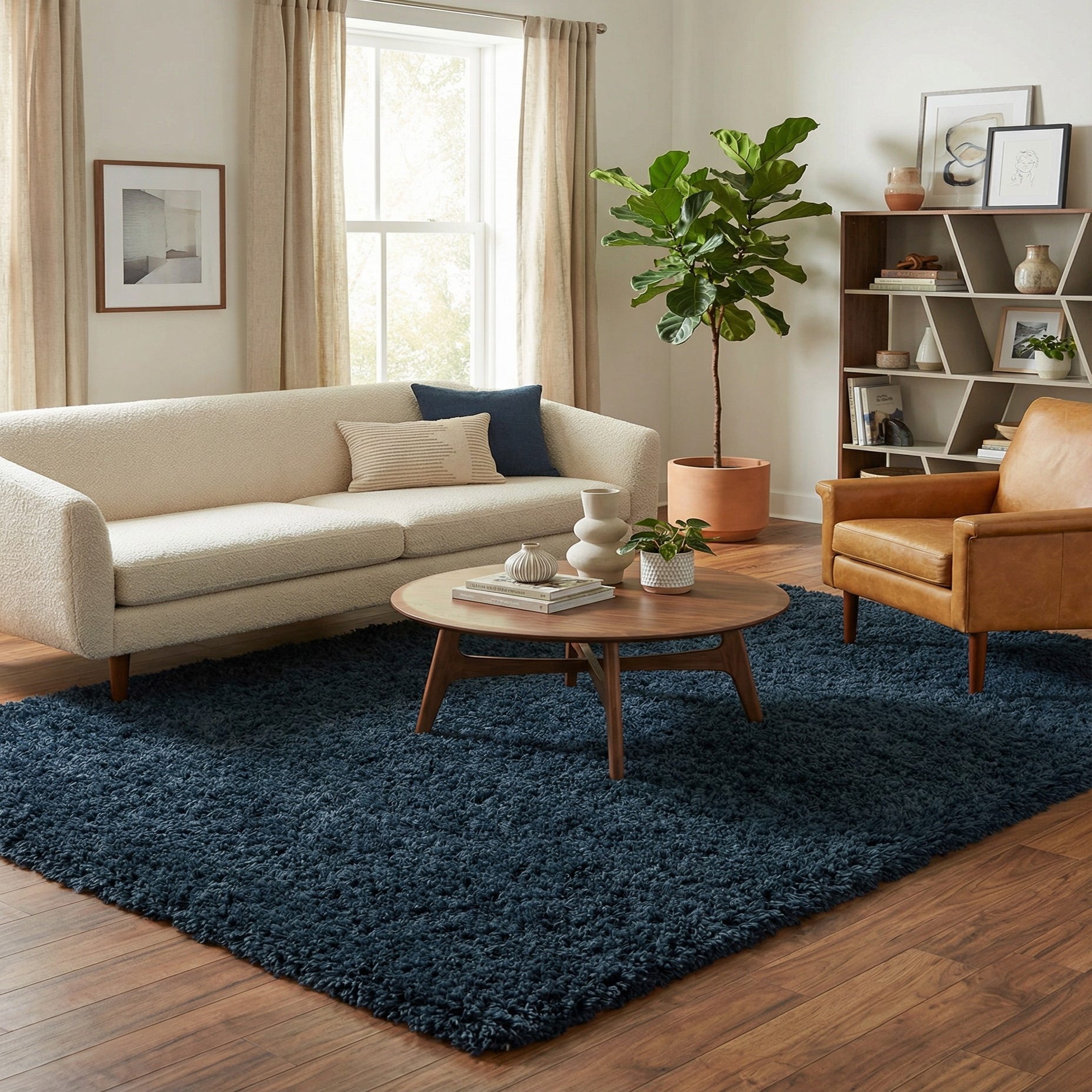 This rug works well as an anchor for a modern living room seating area, layered beneath a low-profile coffee table to warm up hardwood or tile. It also suits a bedroom as a bedside rug for a soft landing, or a cozy reading nook where the pile adds immediate comfort. Pair it with neutral upholstery and warm woods for contrast, or use it to complement navy and jewel-toned accents in a moody, layered scheme.