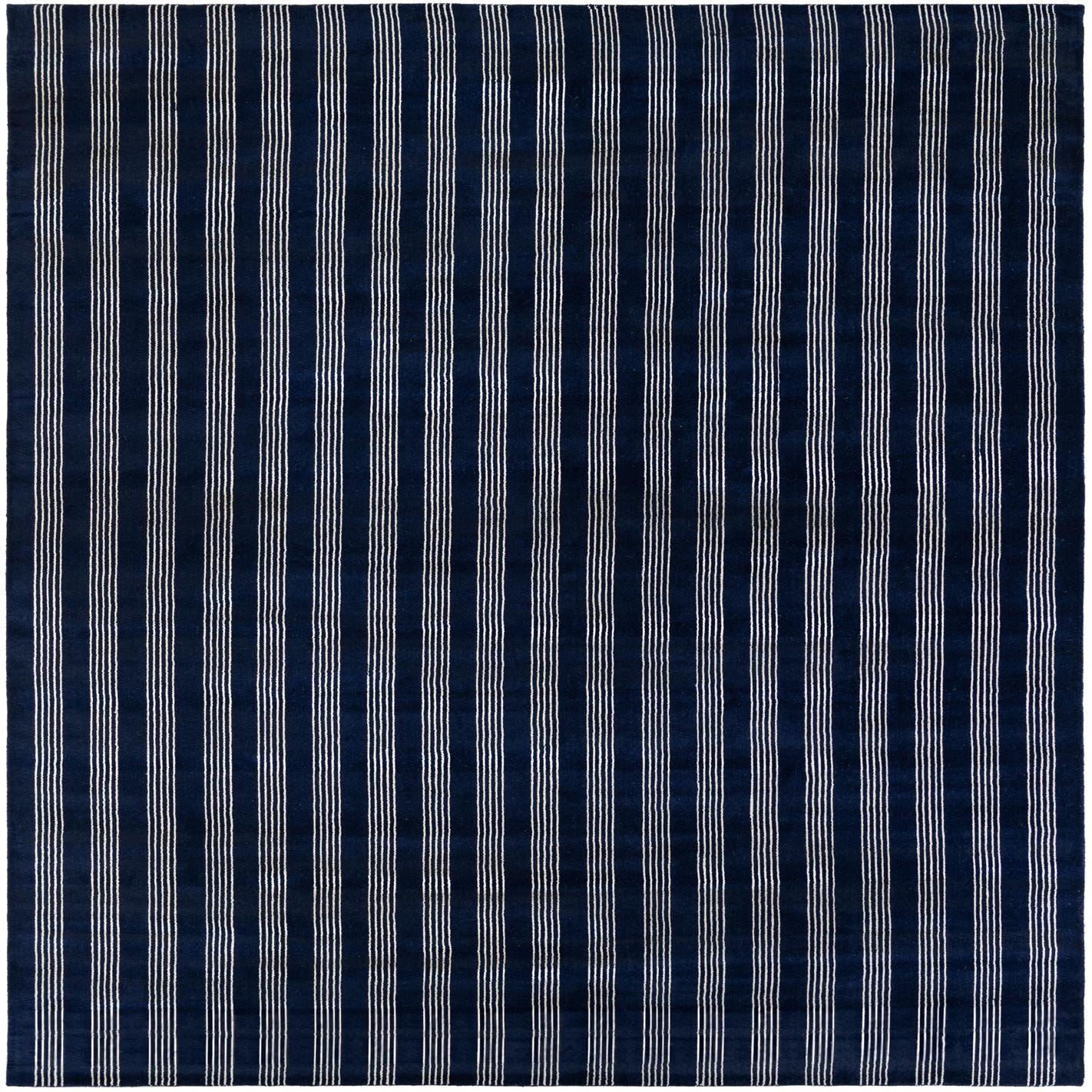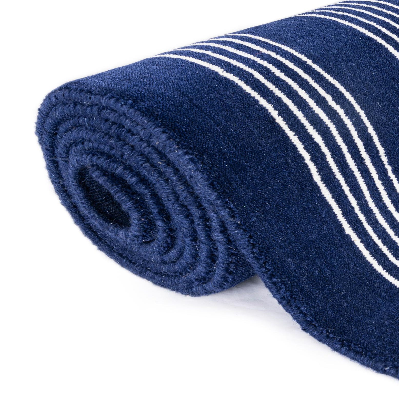 Hand made of 80% wool and 20% cotton, this rug pairs a rich cobalt blue field with crisp ivory pinstripes for a clean, linear look. Narrow vertical stripes—each made up of closely spaced thin ivory lines—run the length of the piece, creating a tailored, rhythmic pattern that reads as both classic and contemporary. The dense wool pile feels soft underfoot and carries a subtle sheen, while the cotton foundation adds structure and a grounded hand.