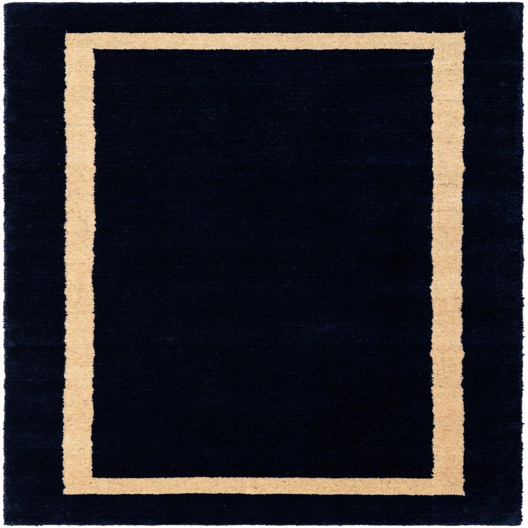 A bold, streamlined border rug with a deep cobalt blue field framed by a clean ivory inner band. The simple rectangular motif brings geometric clarity without fuss, and the ivory border offers a subtle textural contrast against the saturated blue background. Hand-made from 80% wool and 20% cotton, the pile feels soft and slightly dense underfoot while the cotton content gives the piece steady structure and crisp edge definition.