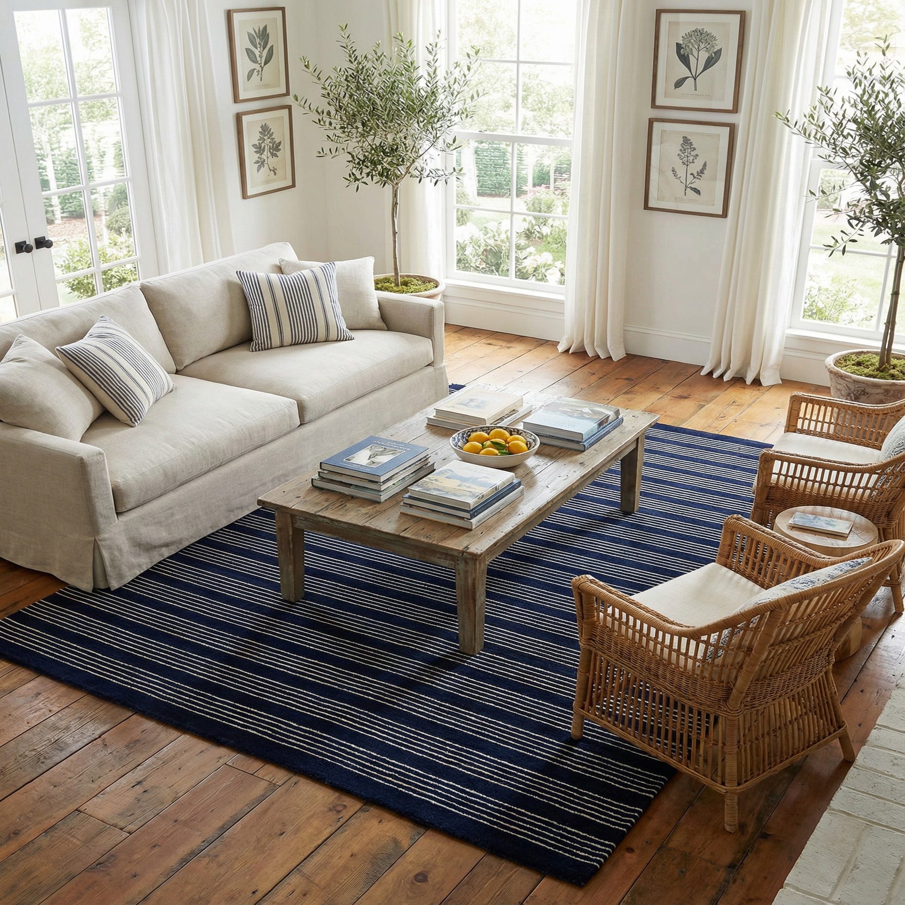 A 6x9 rectangular Jill Zarin Striped Wool rug in cobalt blue with thin white vertical stripes, suitable for a living room.