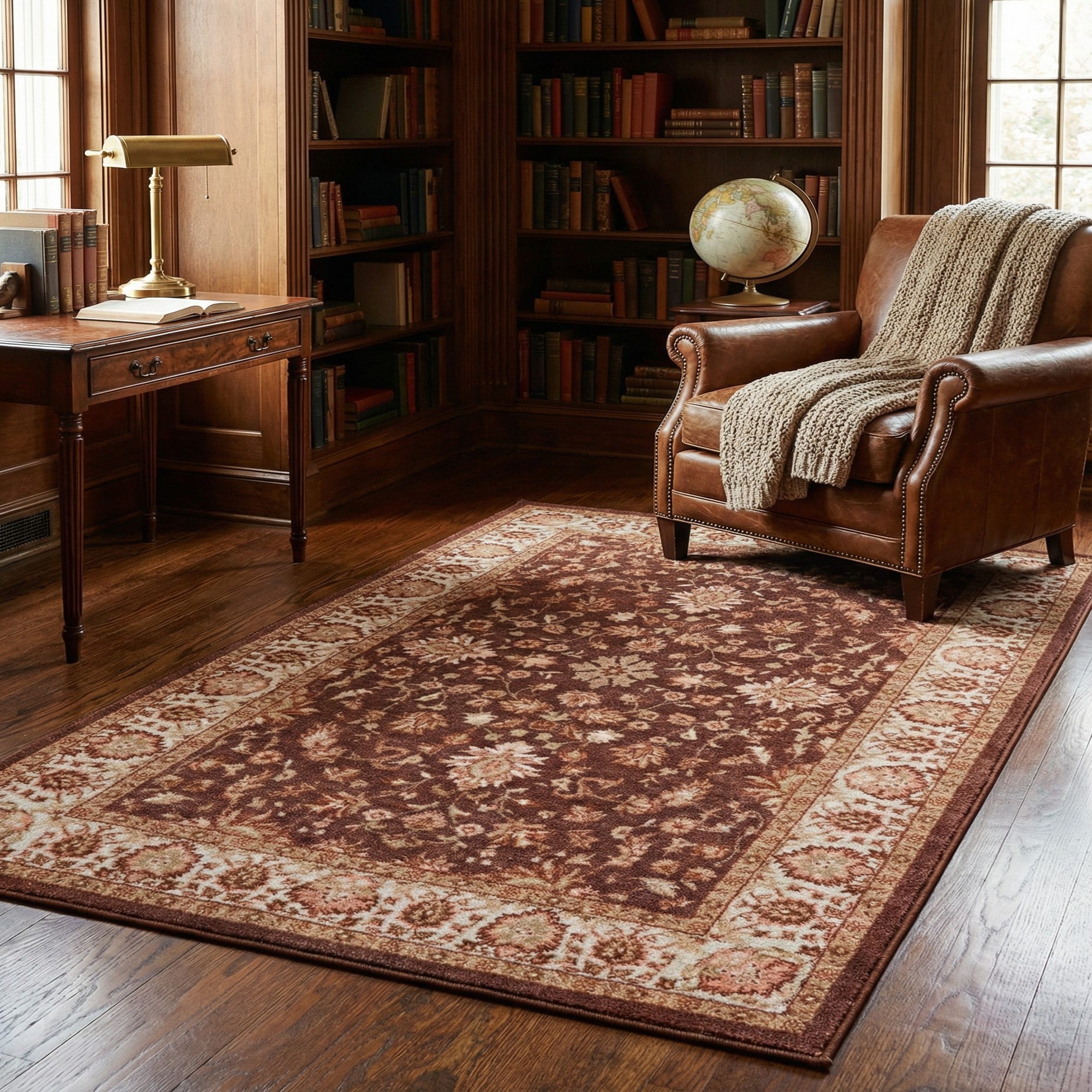 This rug pairs well with warm, transitional interiors—think leather seating, wood finishes and layered textiles—or with classic spaces that benefit from a grounded, patterned anchor. Use it at an entry, beneath a small seating group, or tucked under a console to introduce color and pattern without overpowering the room. The coffee brown base and ivory border make it simple to coordinate with neutral sofas, rust or terracotta accents, and light wood tones.